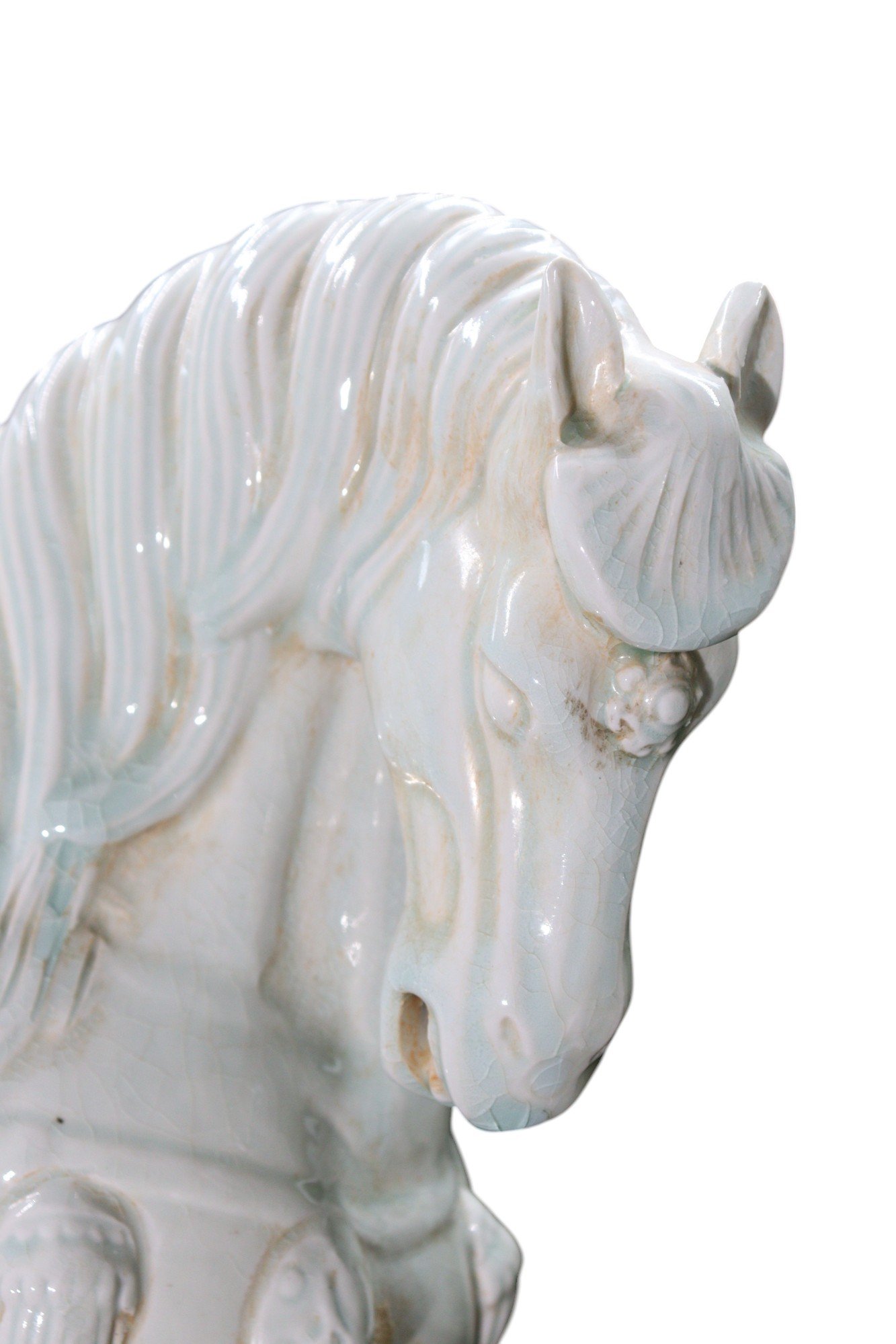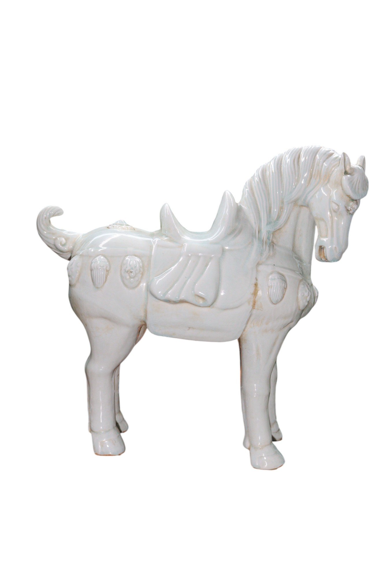 Finely detailed with a full saddle, trappings, and a proud, upright head crowned with a neatly trimmed mane. Subtle crackling and pooling of the glaze around the harness and saddle lend depth and texture to the surface. The horse’s poised yet spirited demeanor embodies the admiration for horses seen throughout Chinese art.