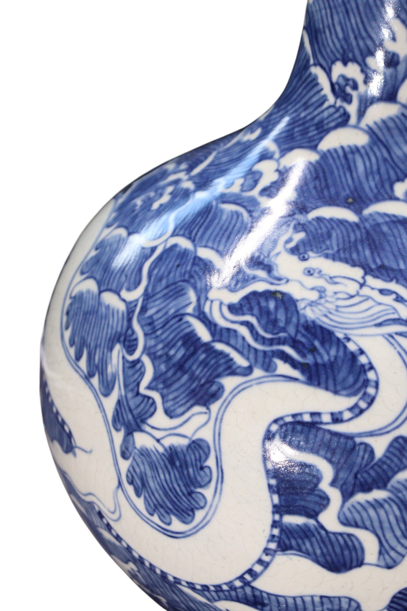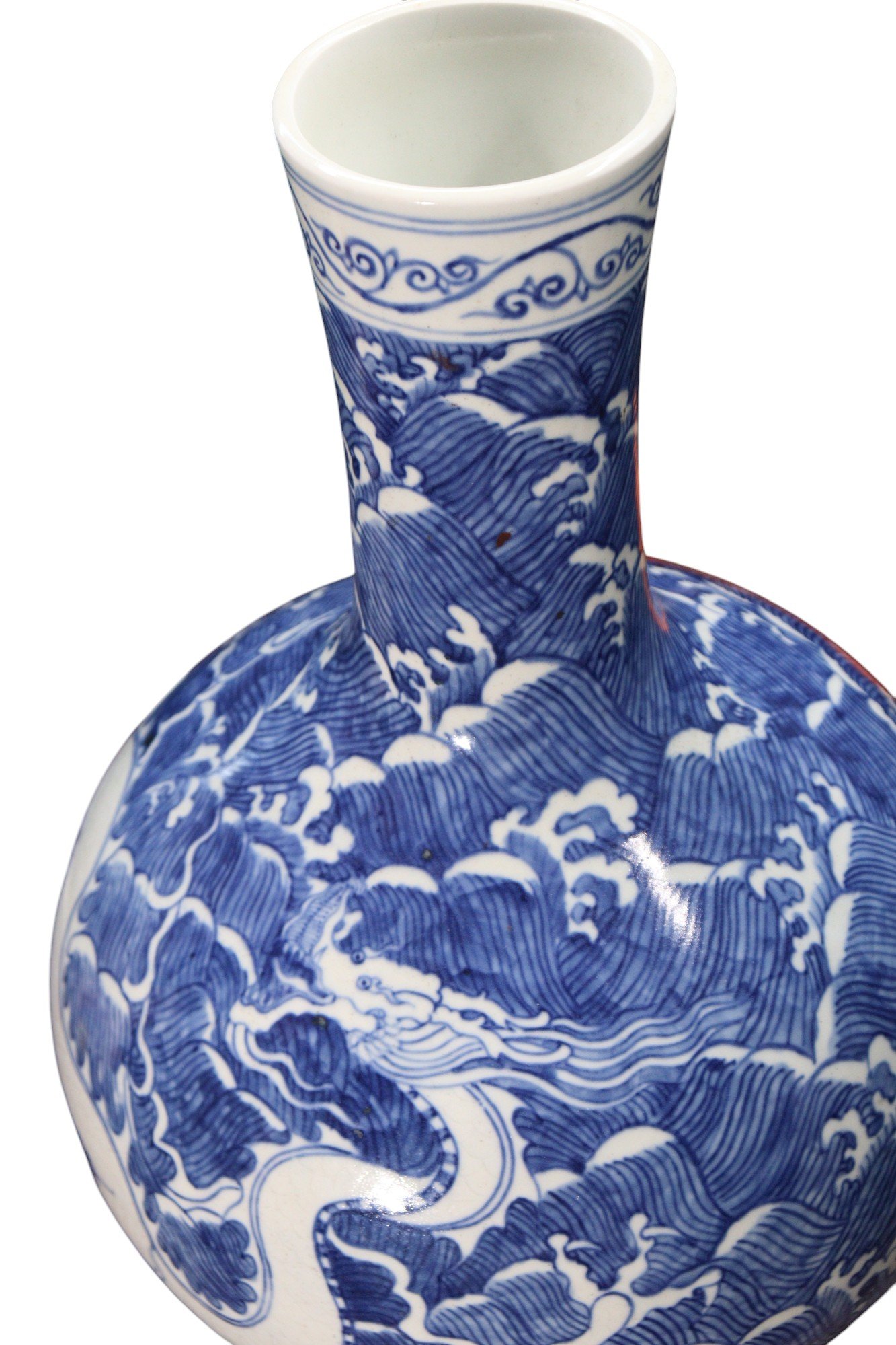 The globular body rising to a slender cylindrical neck, boldly painted in vivid cobalt blue with a sinuous three-clawed dragon emerging from tumultuous cresting waves and swirling clouds. The dragon’s scaly body is depicted in white against a dense blue ground of crashing waves, creating a striking contrast. The design continues seamlessly around the vase, displaying dynamic energy and fine brushwork. The base bears an apocryphal six-character Yongle reign mark.