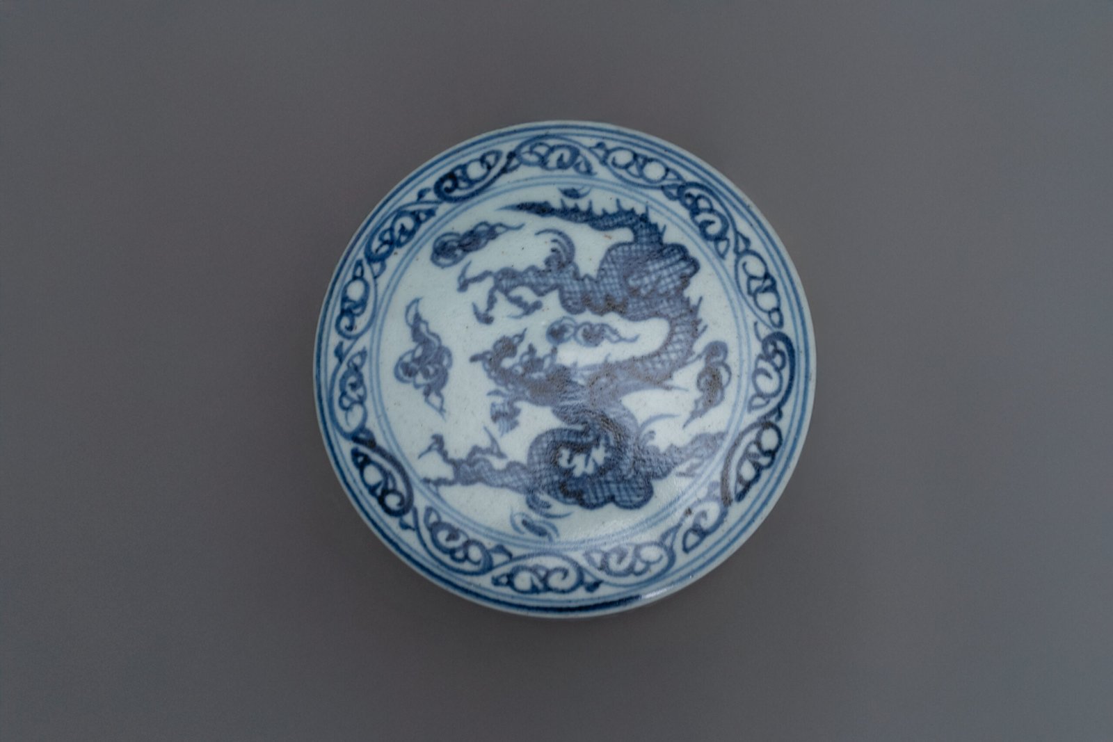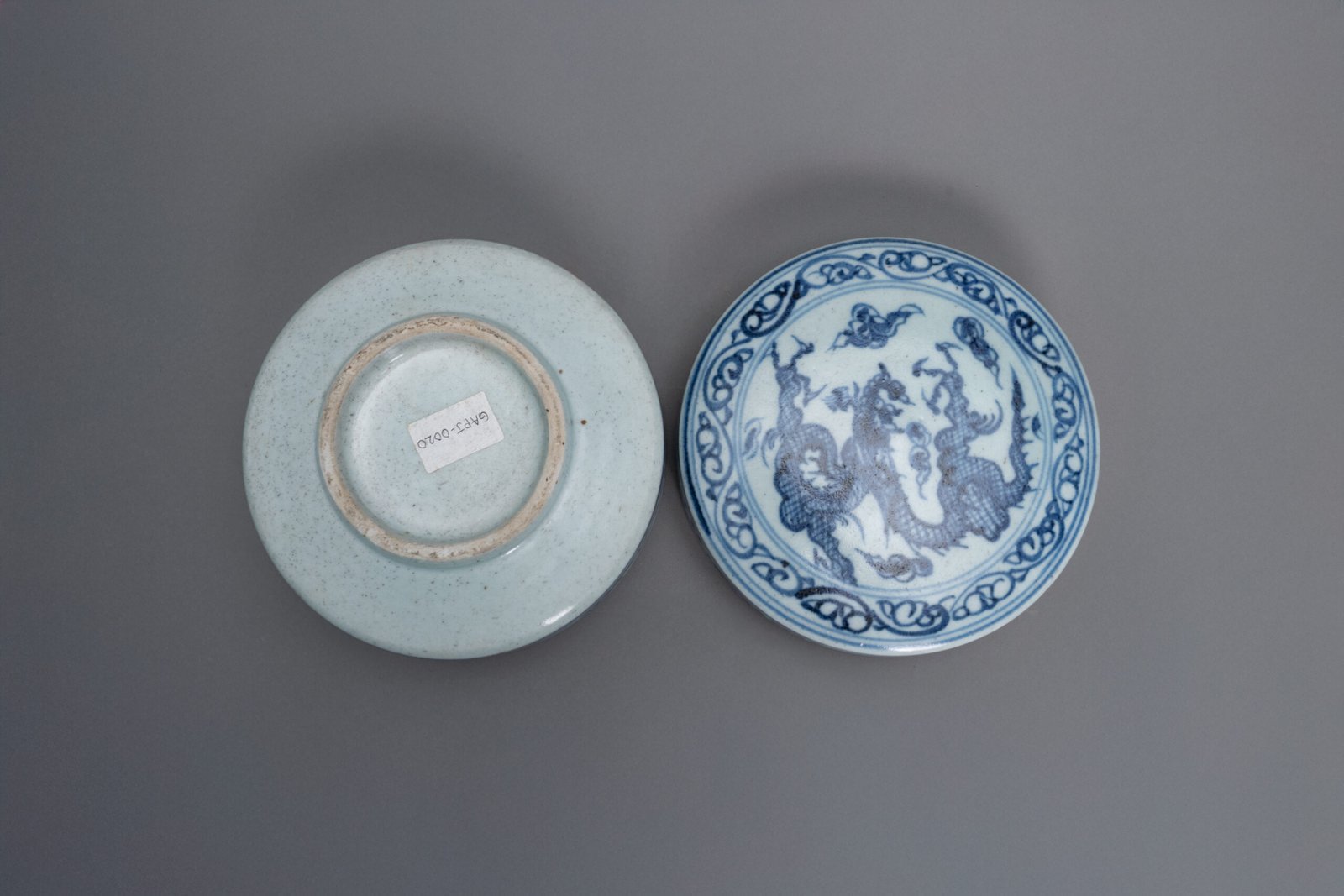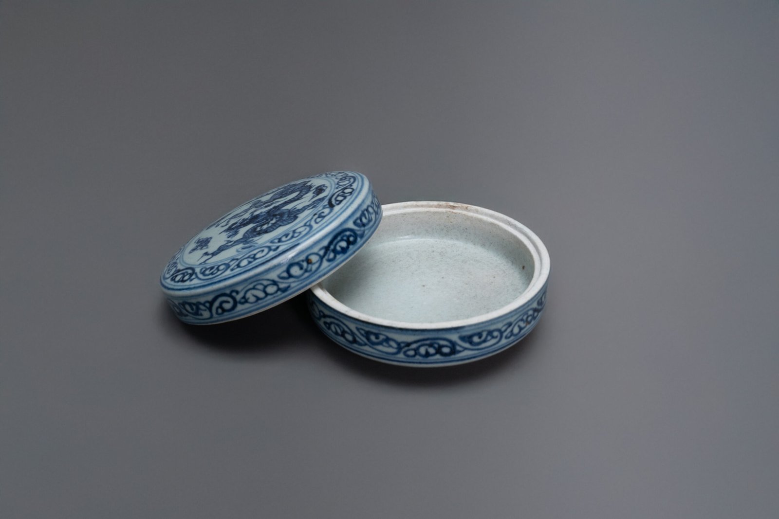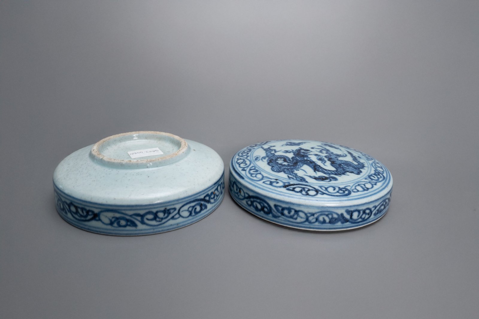 Finely painted in underglaze blue with a lively three-clawed dragon coiled amid stylized clouds, framed by bands of scrolling lotus around the rim and sides. The lid fits snugly onto the shallow body, which mirrors the scrolling lotus pattern. The interior is glazed, while the base is left unglazed around the footrim.