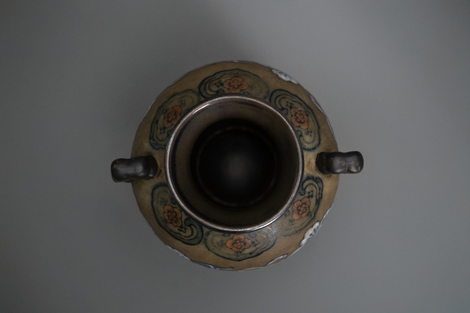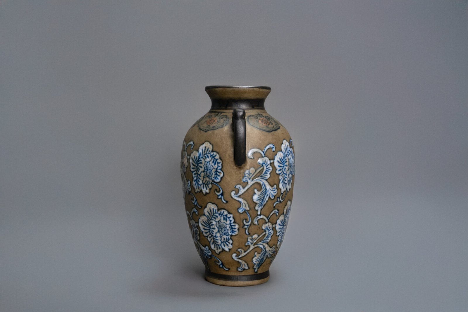 The baluster-shaped body rising to a waisted neck and flaring mouth, flanked by a pair of elaborate scroll handles. The exterior is finely decorated with a continuous pattern of vibrant blue and white peony blossoms borne on curling leafy tendrils, reserved against a warm, coffee-brown ground. The shoulder is encircled with a band of stylized ruyi heads enclosing red-orange floral medallions.