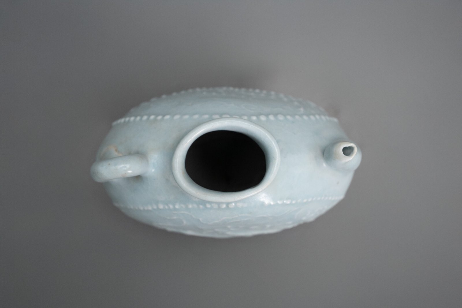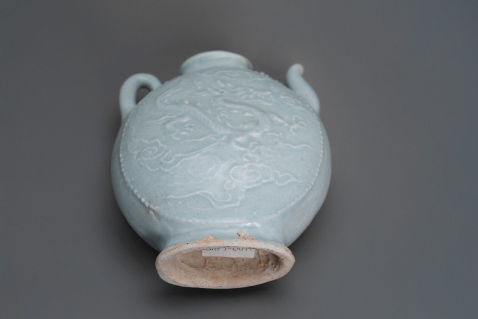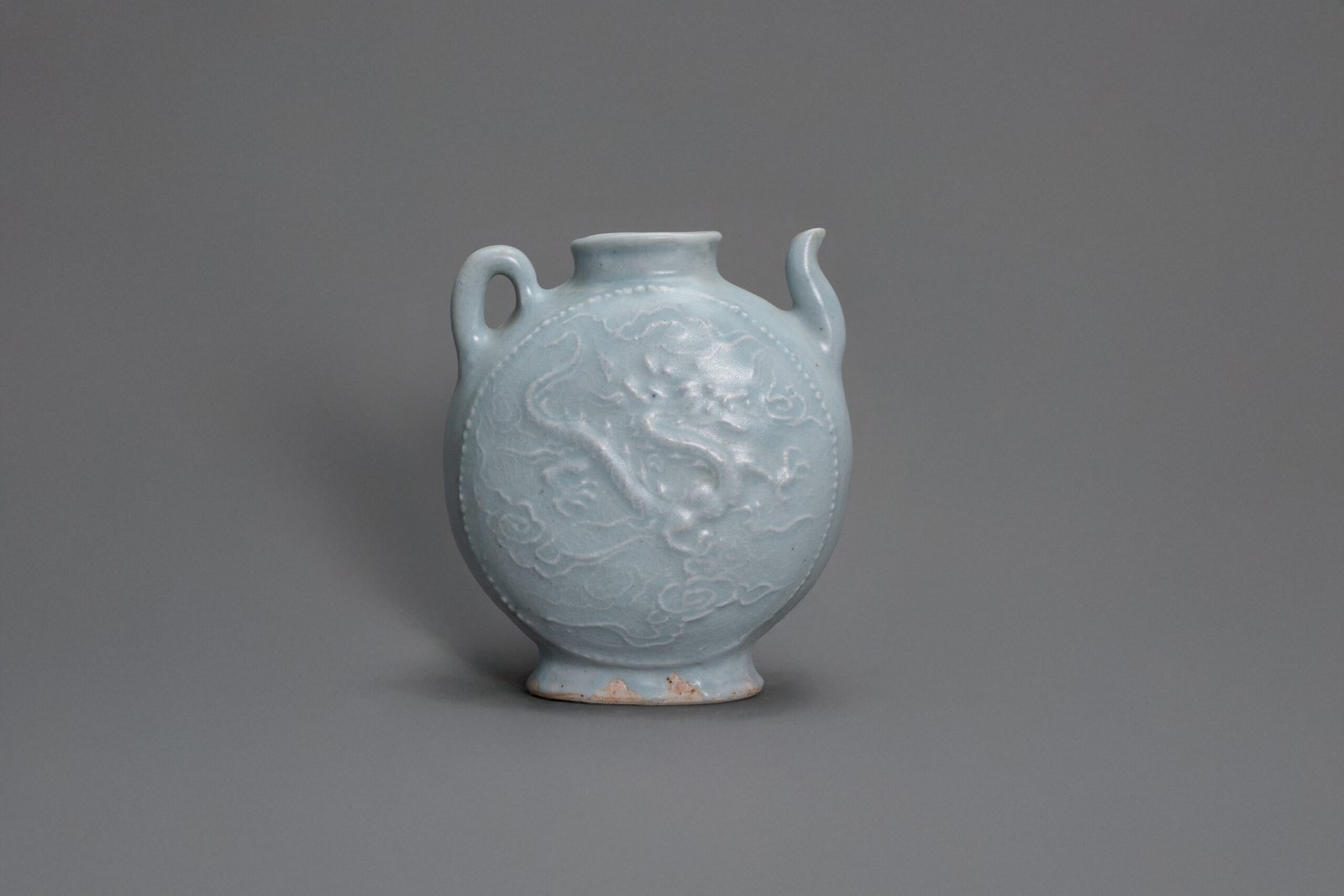 This elegant ewer is crisply molded on each side with a lively dragon and a soaring phoenix amidst swirling cloud scrolls, framed by a beaded border around the medallions. The vessel is fitted with a short waisted neck, surmounted by a lipped mouth, and flanked by an elegantly curved spout and a loop handle extending from the shoulder to the rim. The body is covered overall in a soft, translucent Qingbai glaze.