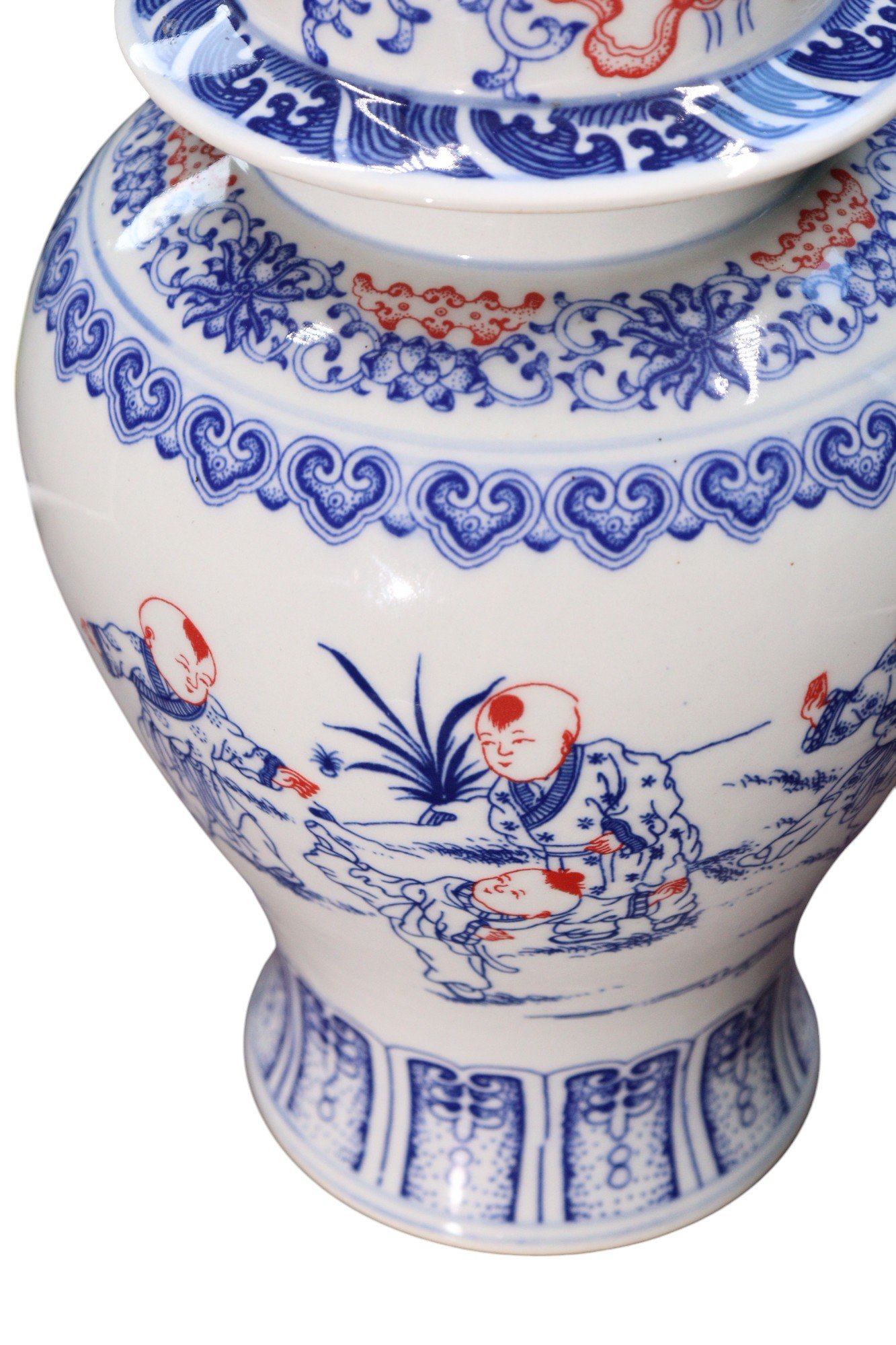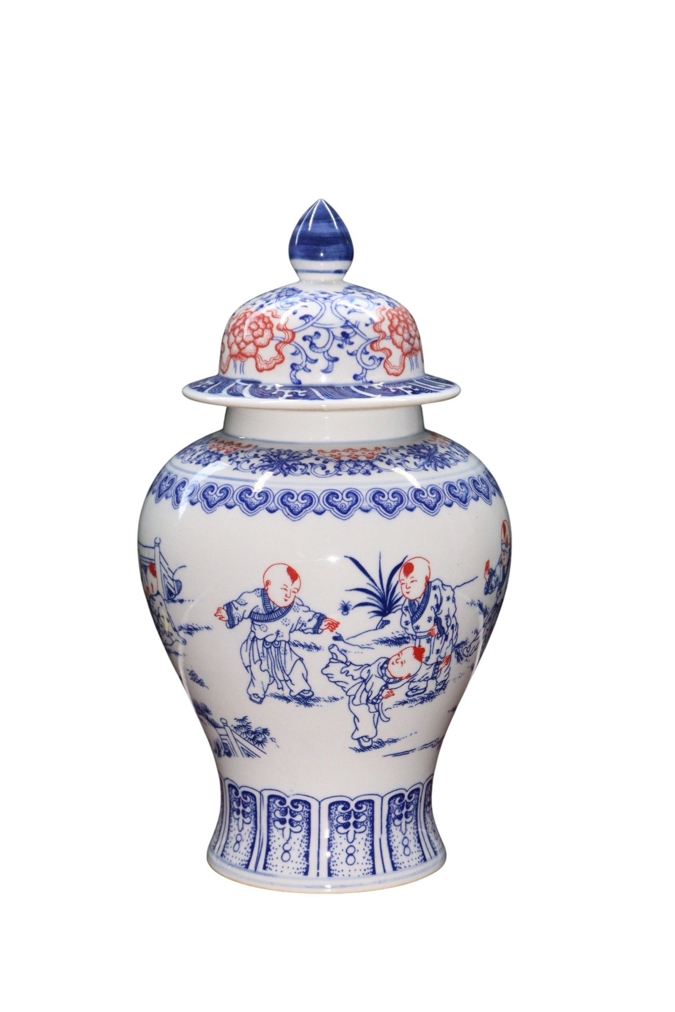 Painted in underglaze blue and iron-red, depicting a lively scene of boys at play in a garden setting, surrounded by flowering plants and rocks. The neck is encircled by ruyi-head and lotus-scroll bands, while the domed cover is decorated with blooming peonies above a petal-lappet border and surmounted by a pointed knop.