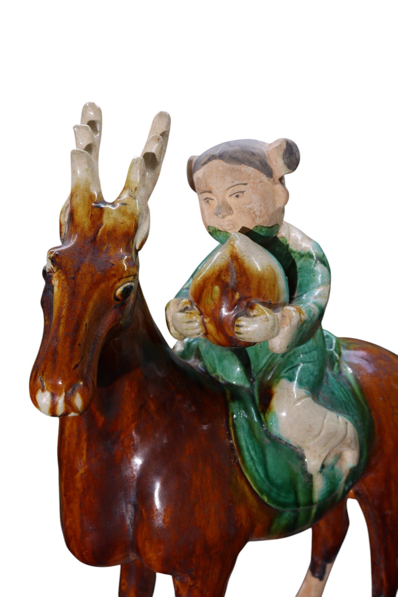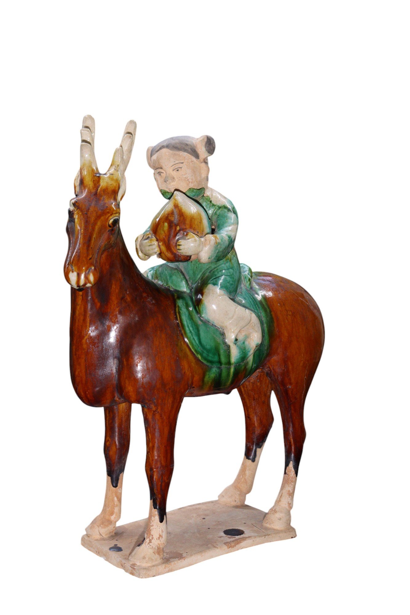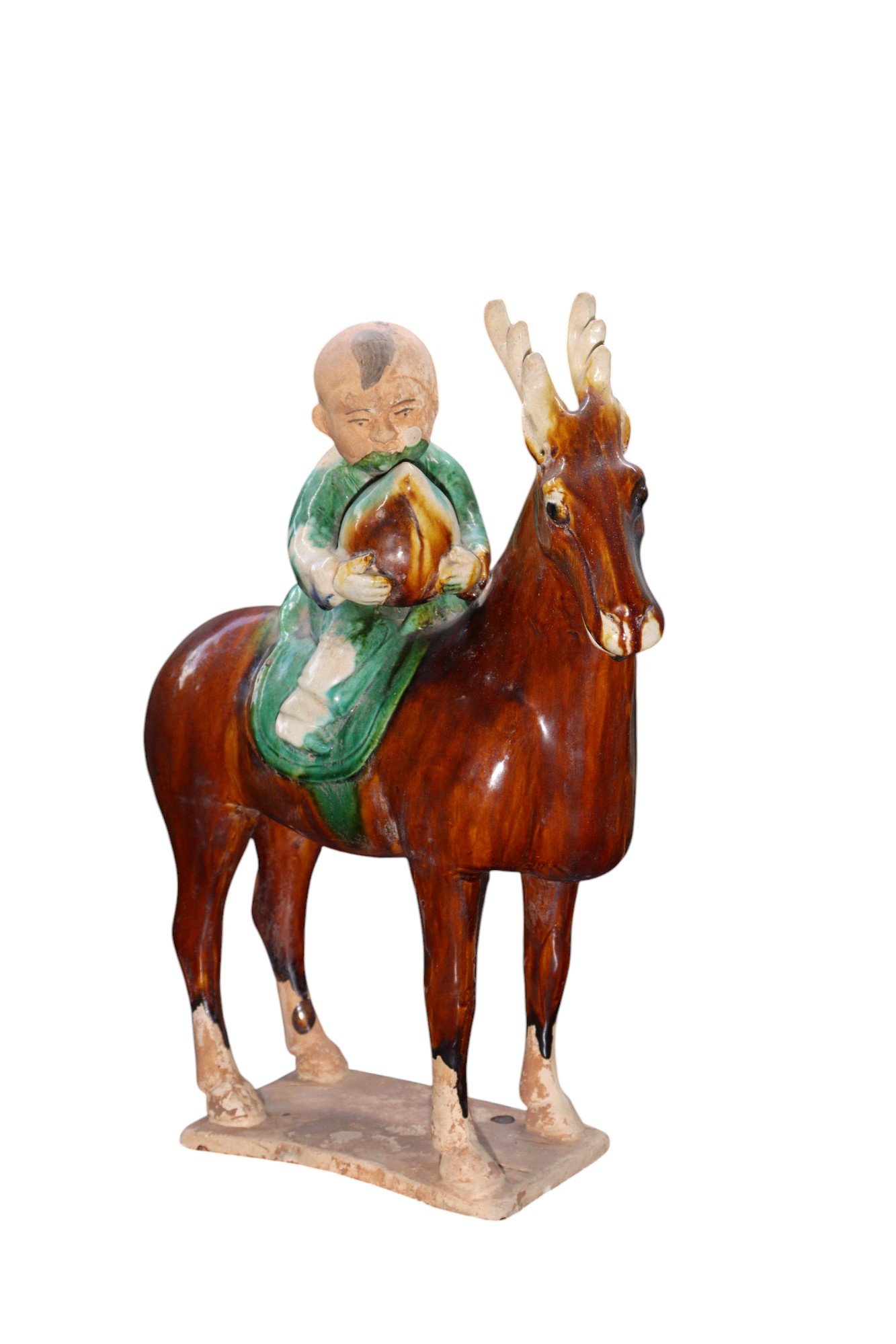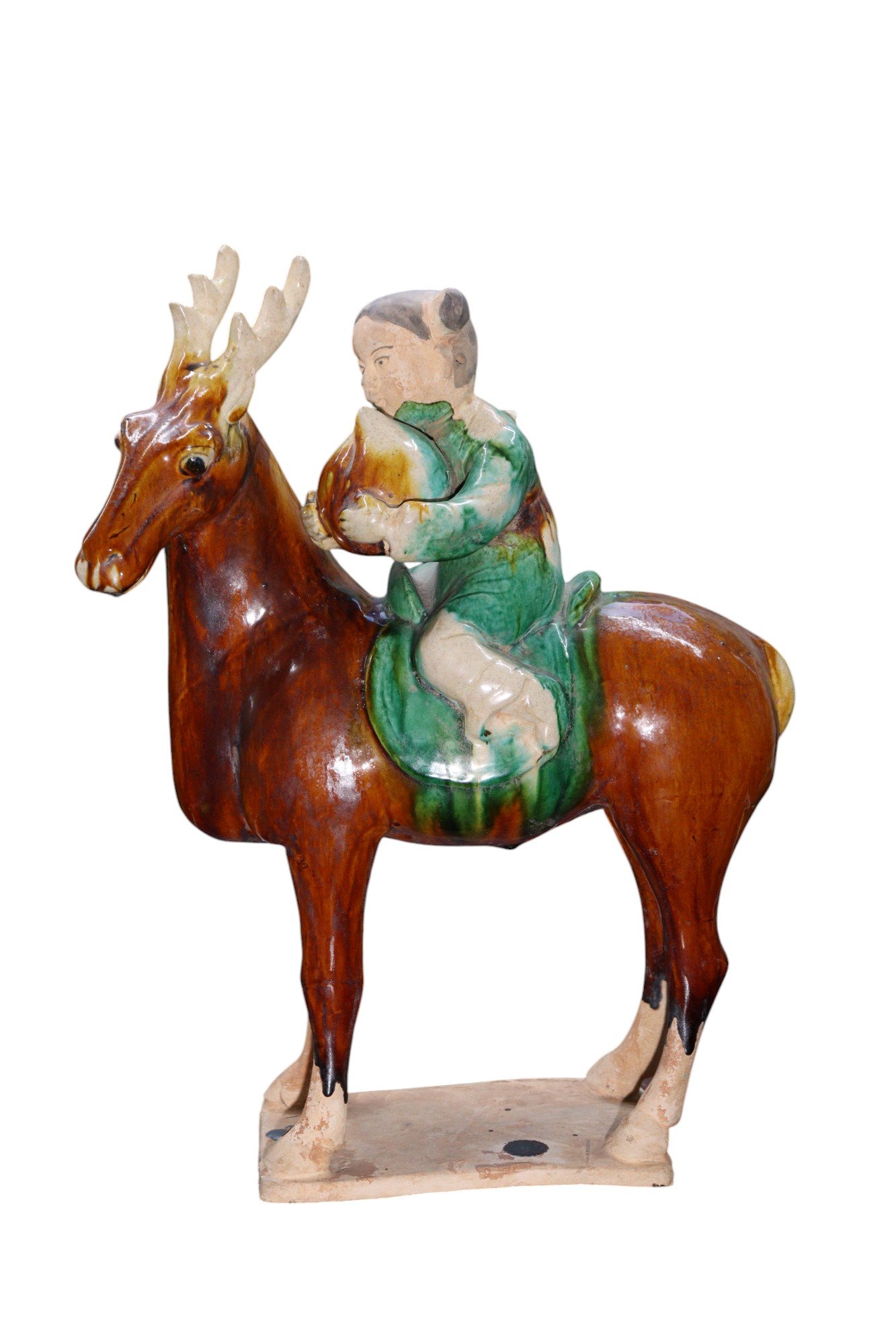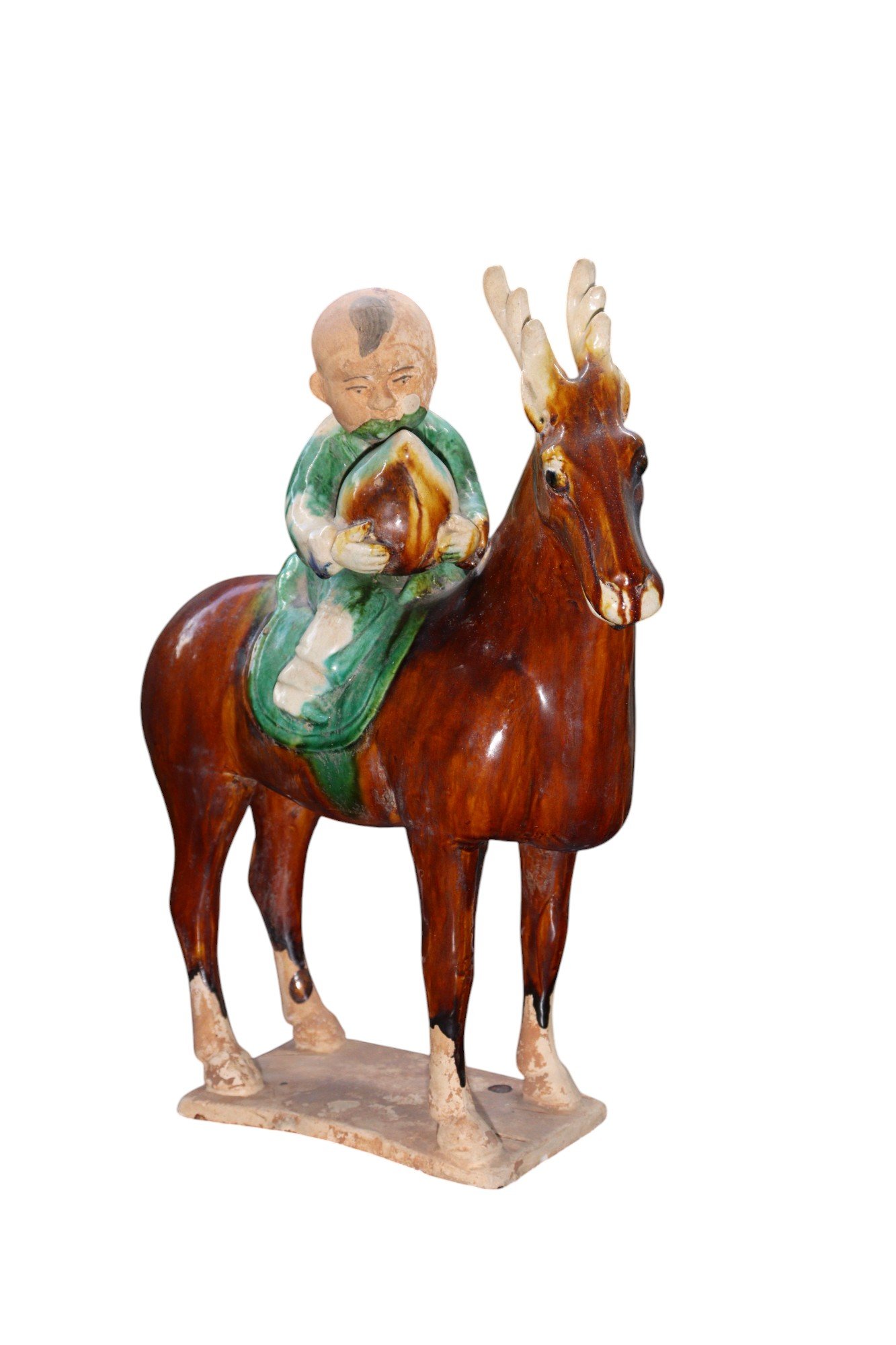 Each figure depicts a young rider—one boy and one girl—seated atop a dynamically modeled reindeer, both rendered with expressive detail and vibrant sancai glaze. Likely inspired by the Tsaatan or Dukha people, the semi-nomadic reindeer herding communities of northern Mongolia, the figures wear flowing green robes and hold peaches, symbolic of longevity and auspicious fortune. The reindeer are captured mid-stride, their antlers finely articulated and their postures animated. The warm amber, green, and cream tones of the glaze evoke the celebrated sancai tradition of the Tang dynasty.