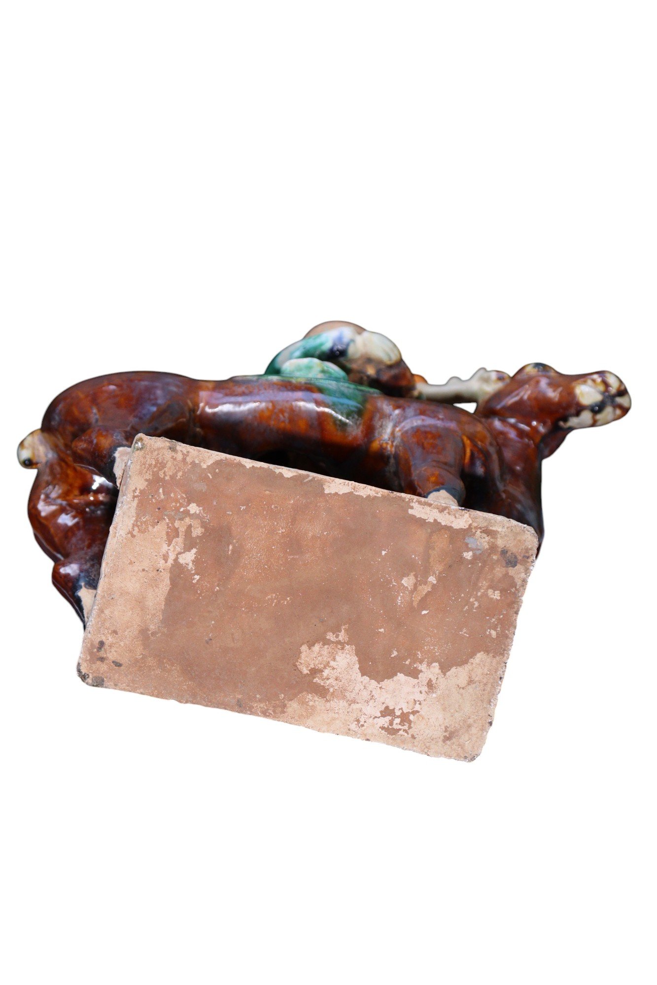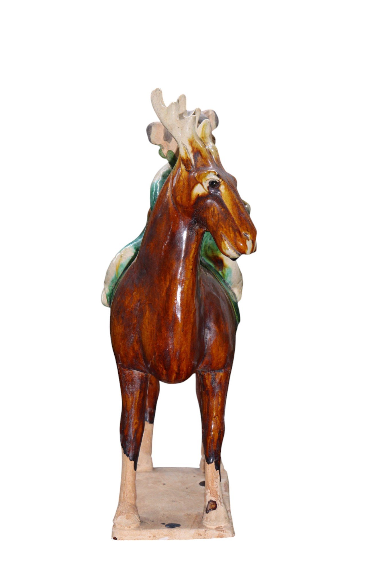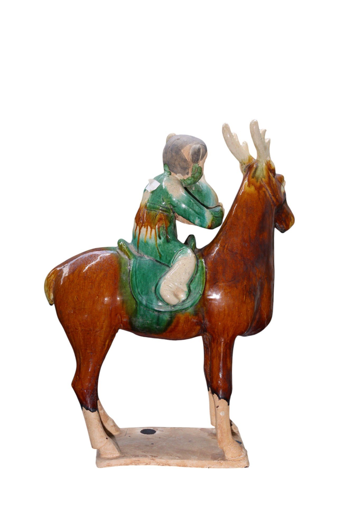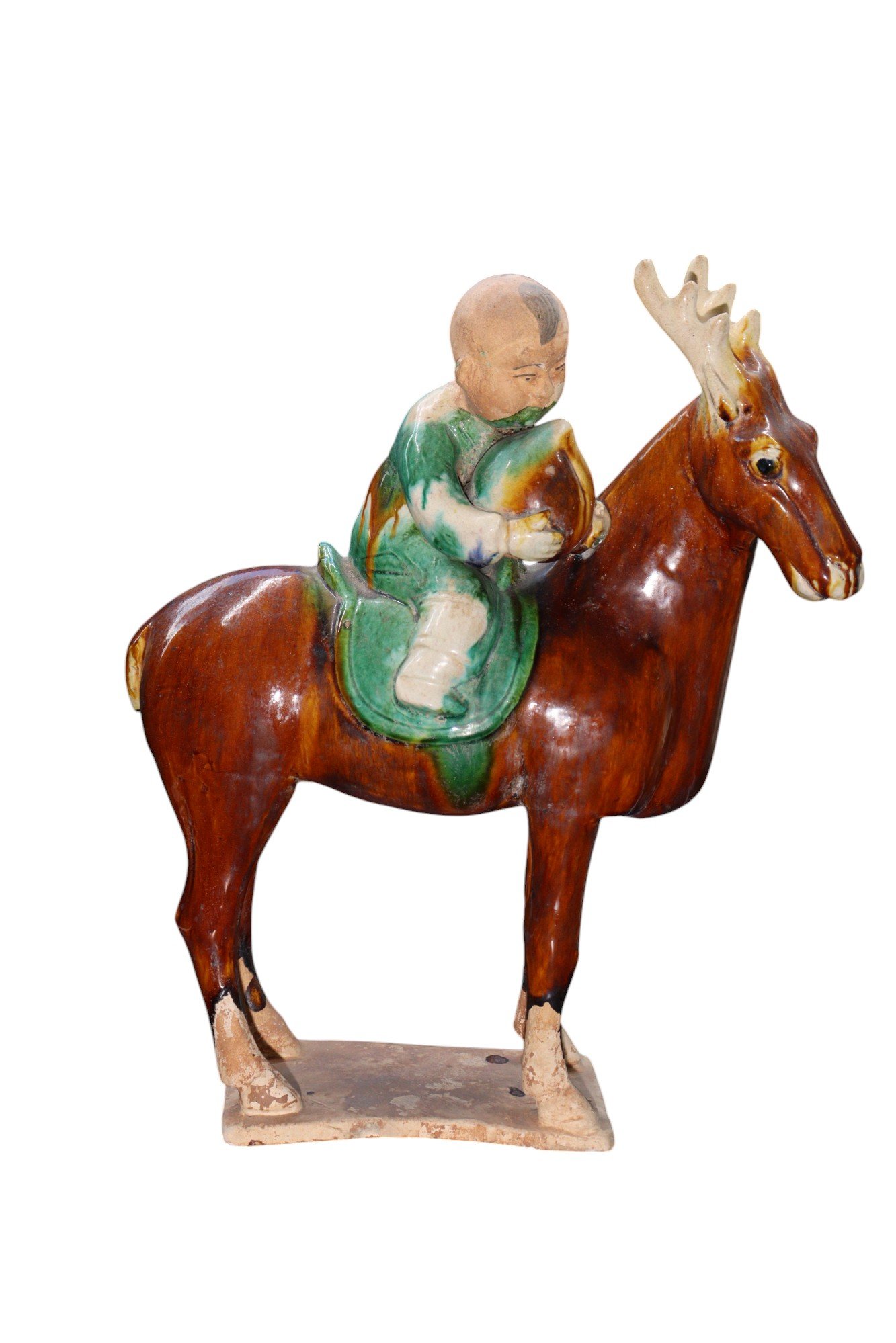 A PAIR OF SANCAI-GLAZED POTTERY FIGURES OF A BOY AND GIRL ON REINDEER