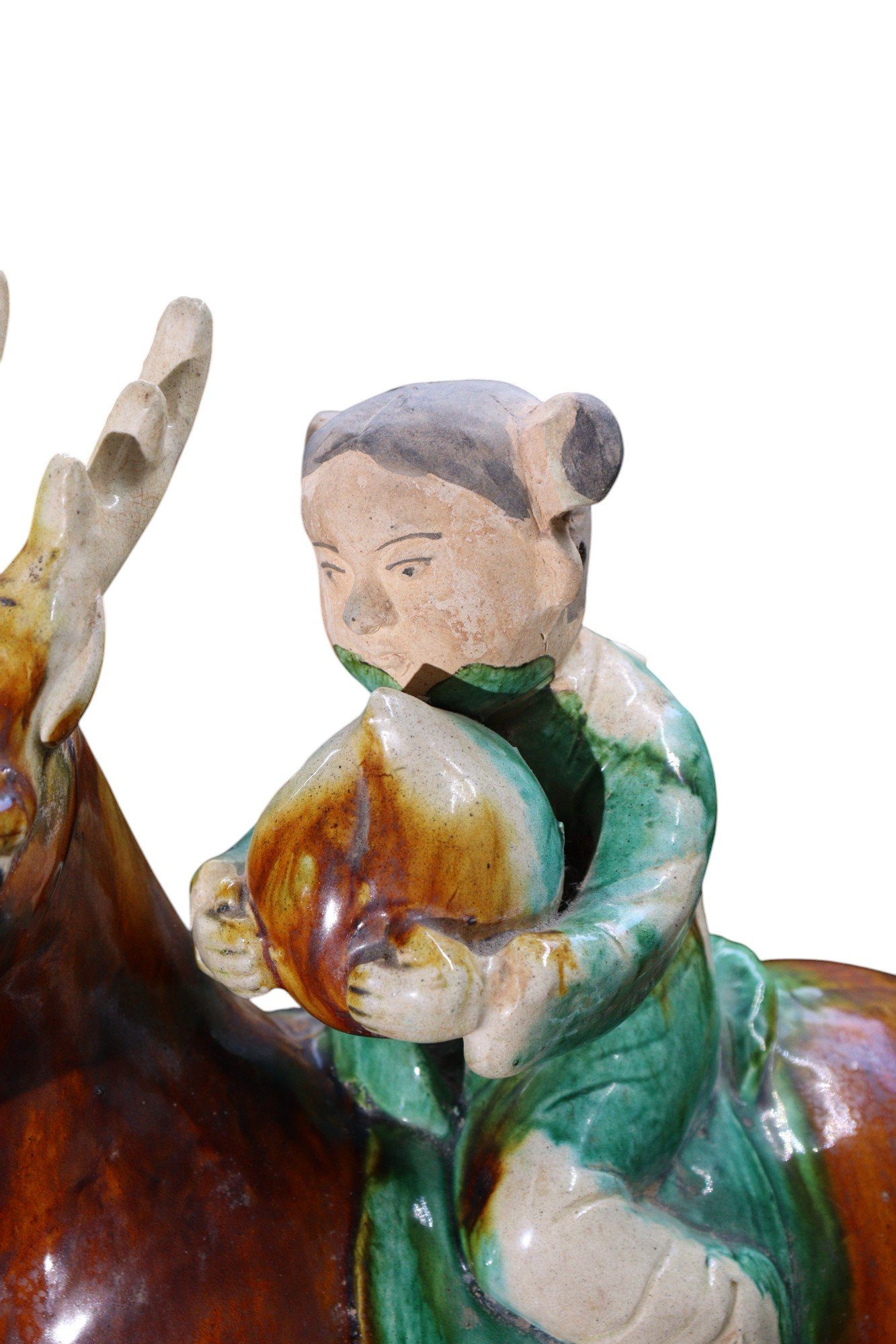 A Tang-style figure depicting a young boy seated on a reindeer, likely representing the Tsaatan or Dukha people, a semi-nomadic reindeer herding community from northern Mongolia. The boy is dressed in a green robe, holding a peach, while the animal is depicted in a dynamic pose with its antlers beautifully modeled in fine detail.