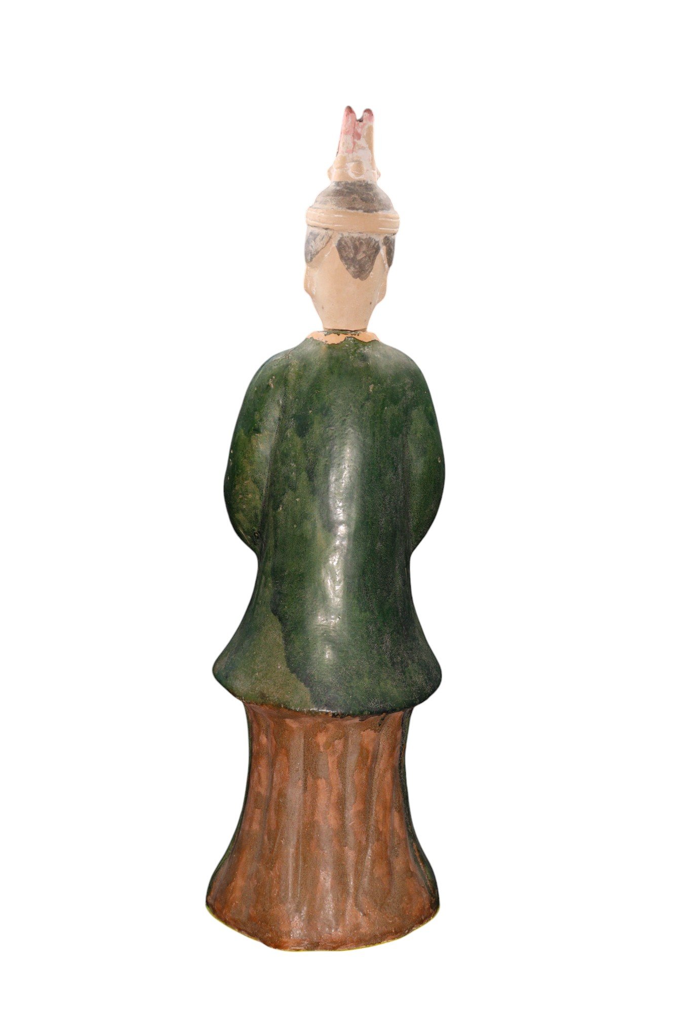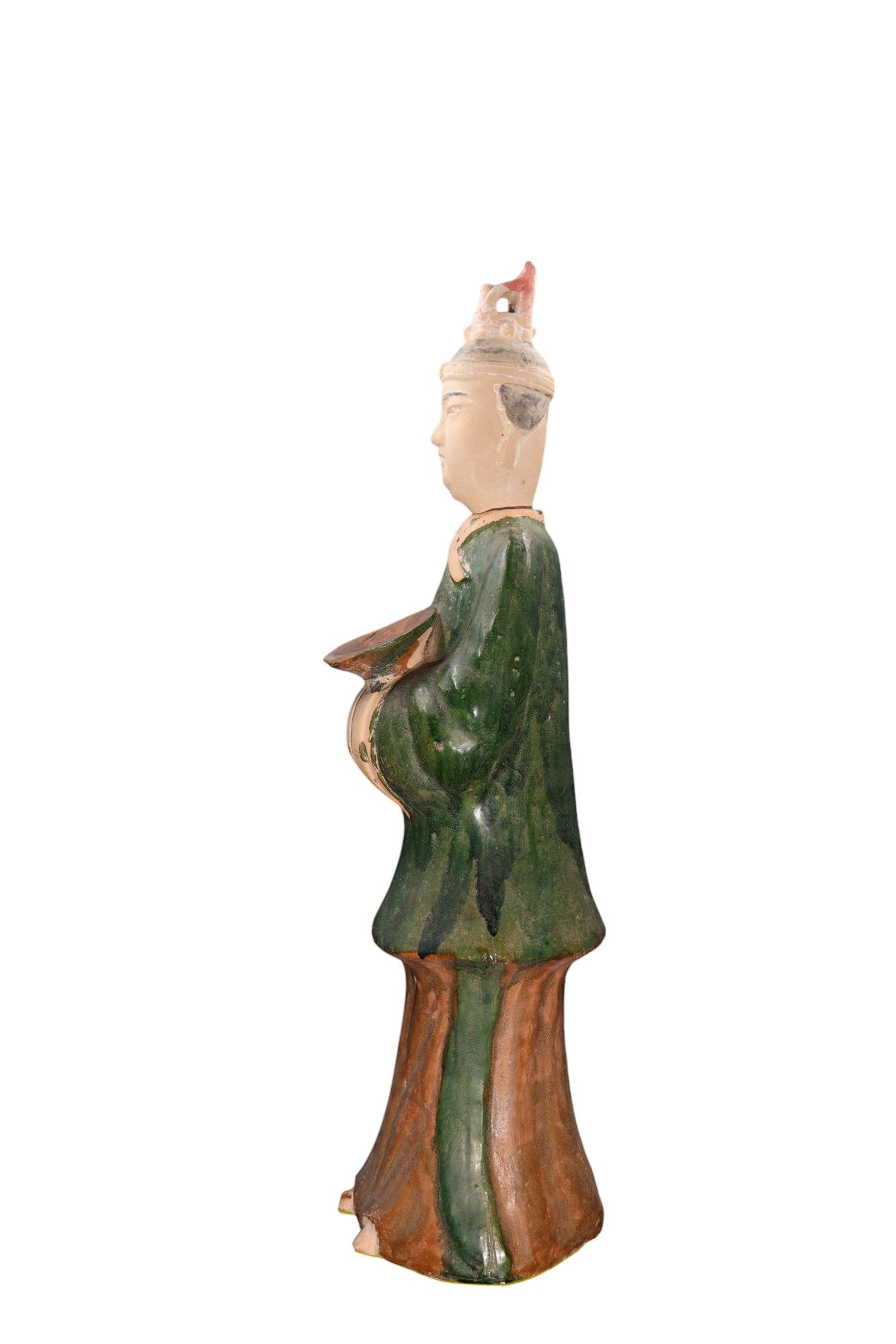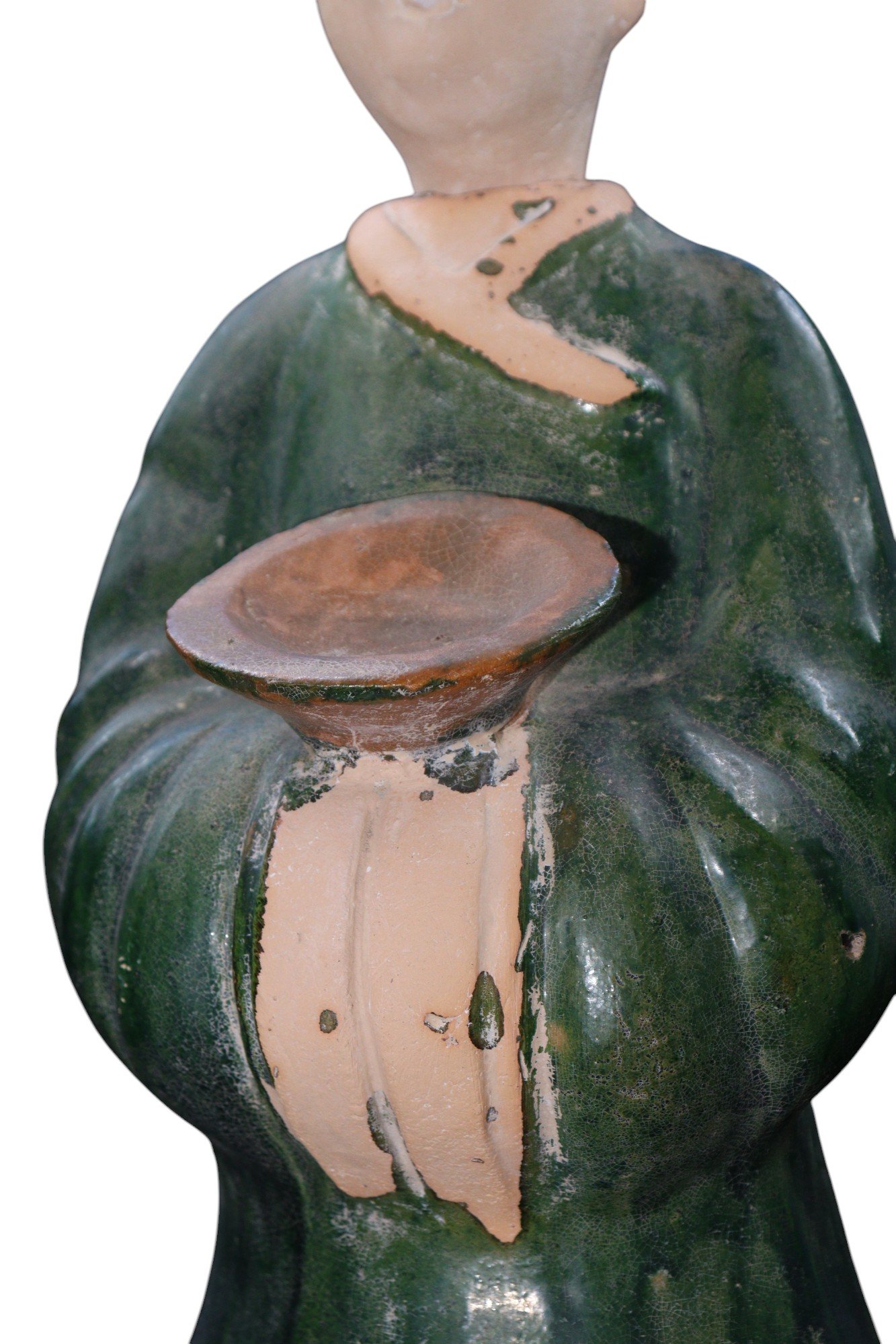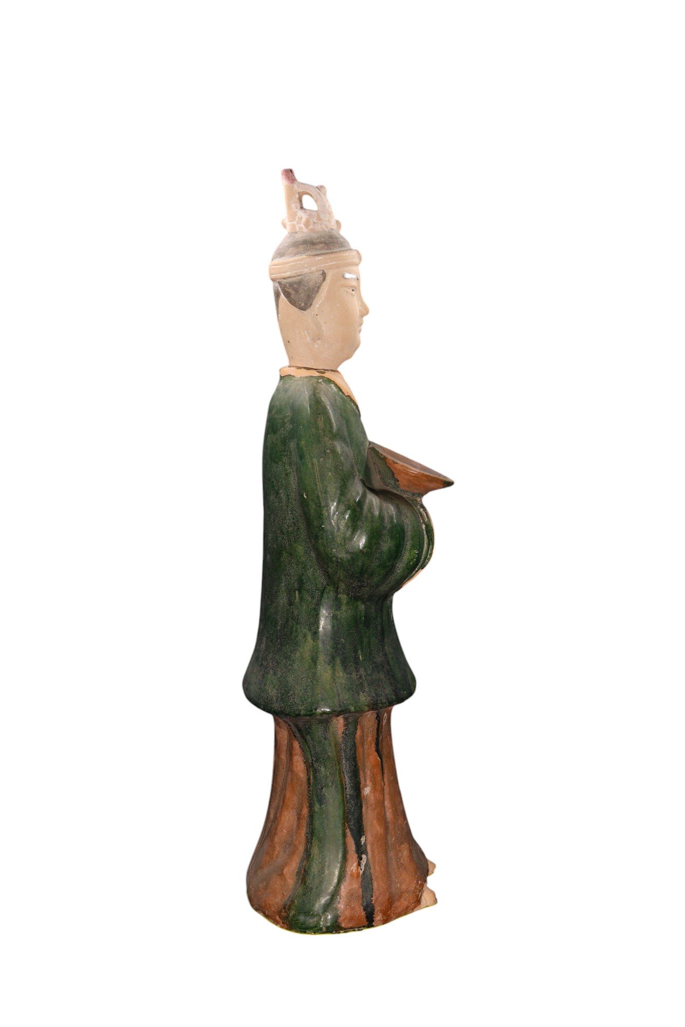 Tang style sancai-glazed figure depicting an attendant holding an offering bowl with a molded removable head wearing an elaborate traditional cap. The robes are glazed in green and brown tones, with the glaze flowing naturally from the folds.