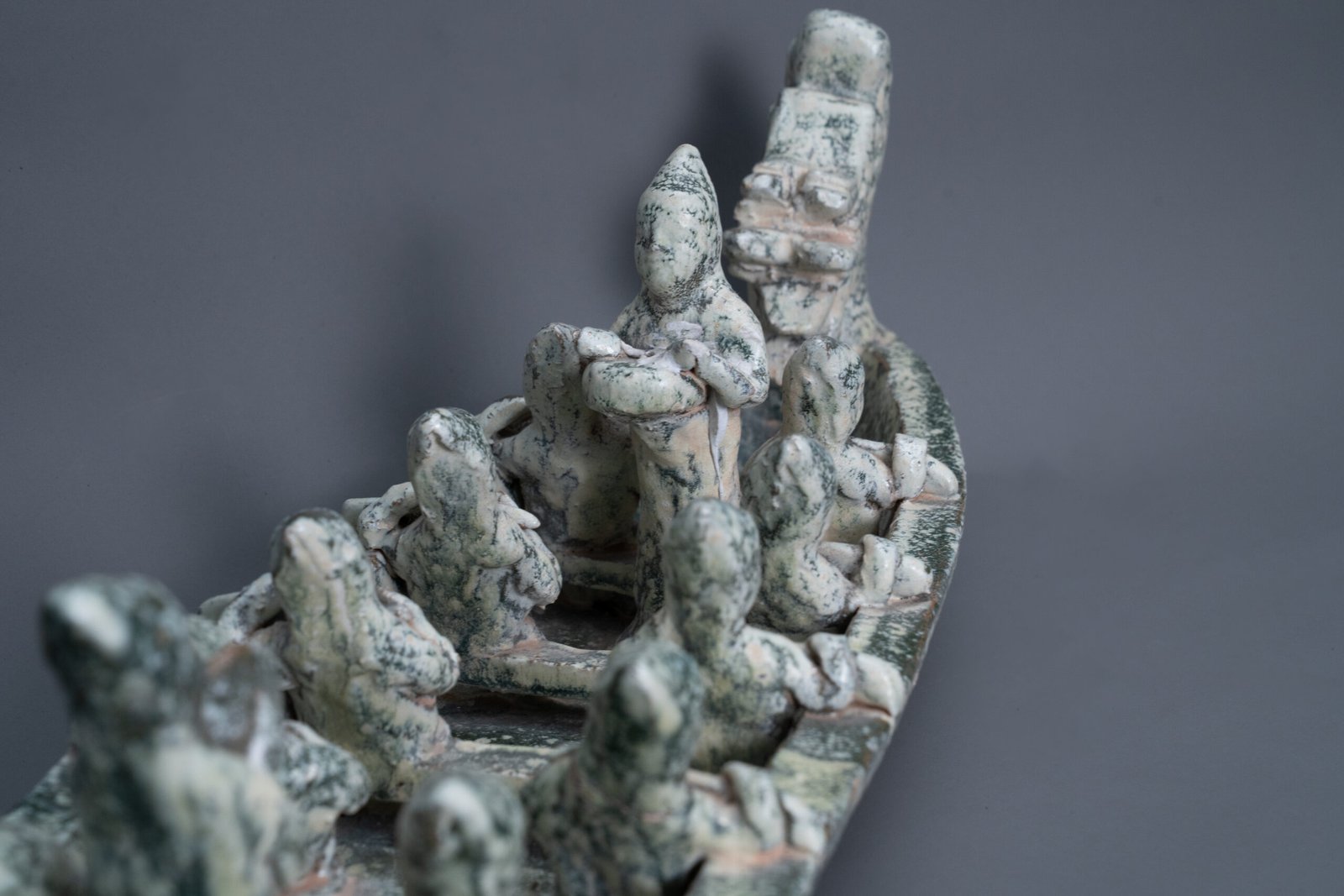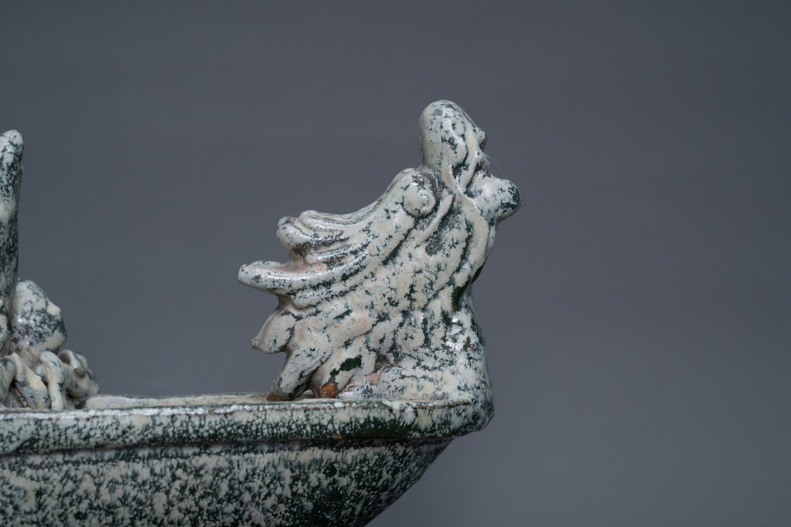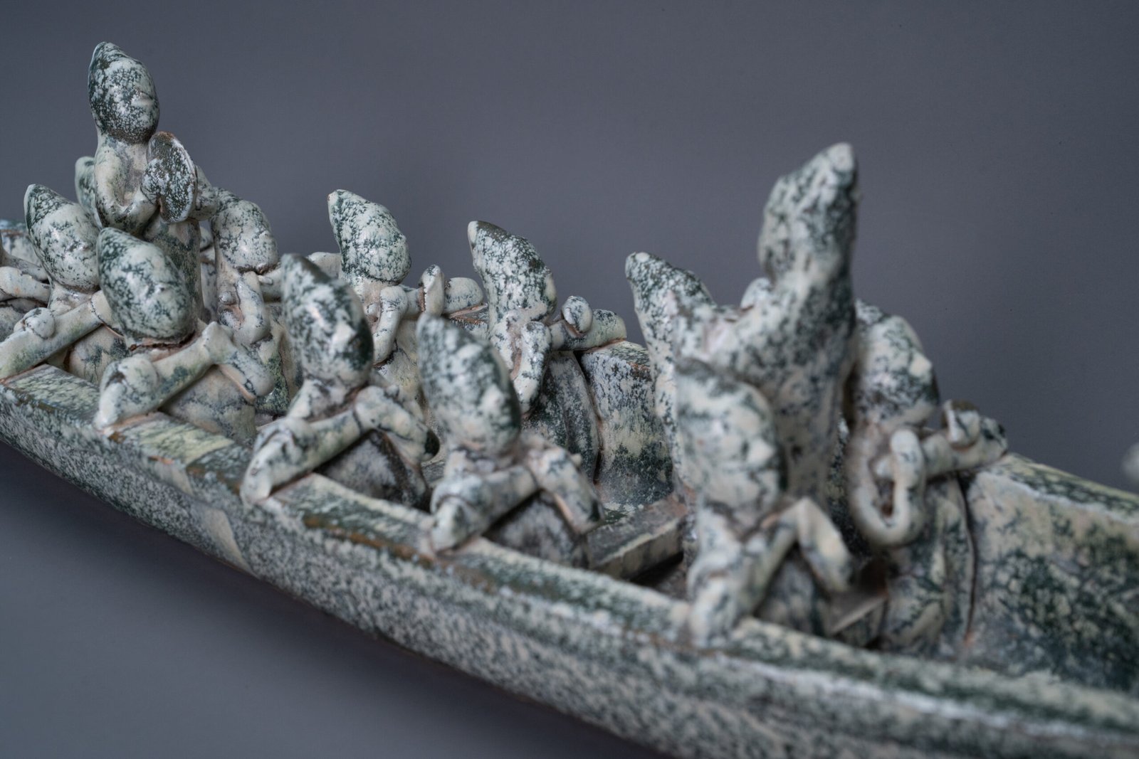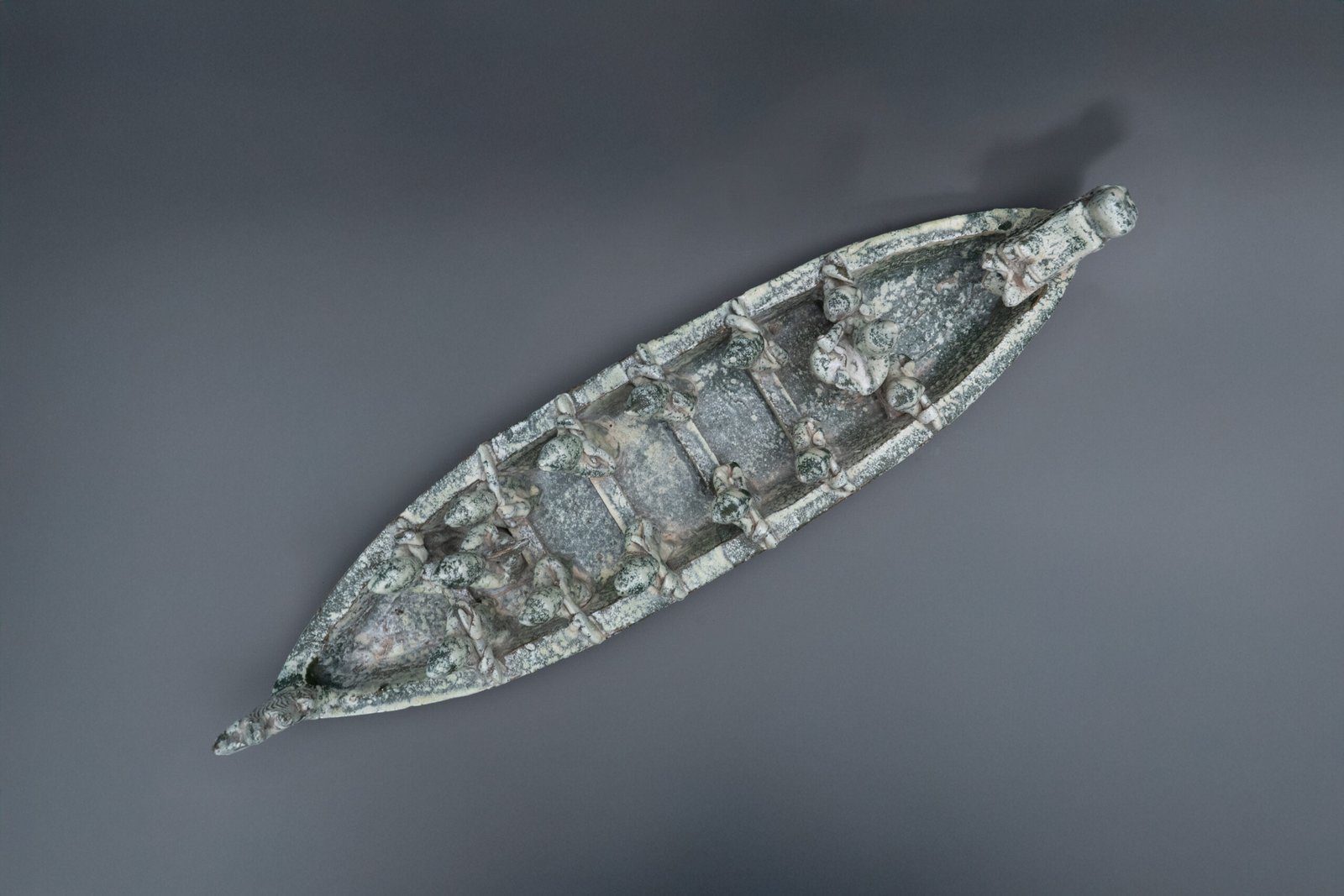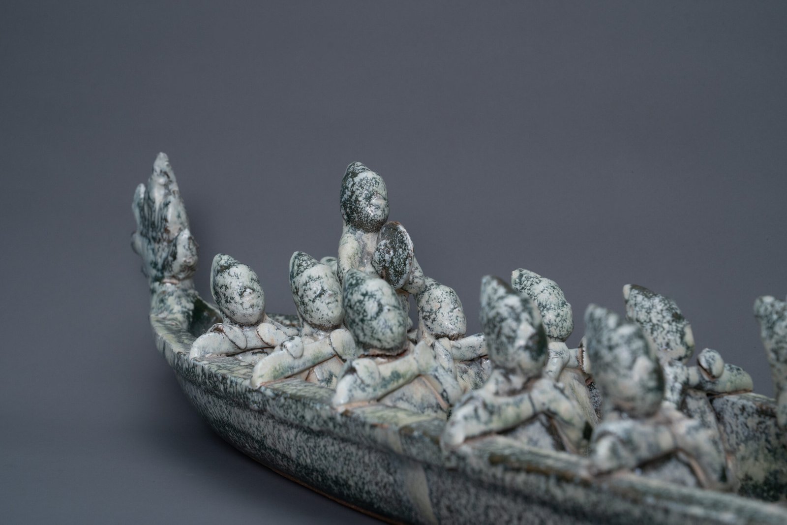 Elongated vessel shaped as a dragon boat with a dragon head prow and a flaming tail, the sides rising in a gentle arc. Seated along the boat are a row of figures depicted in dynamic rowing postures. Covered overall in a mottled green glaze.