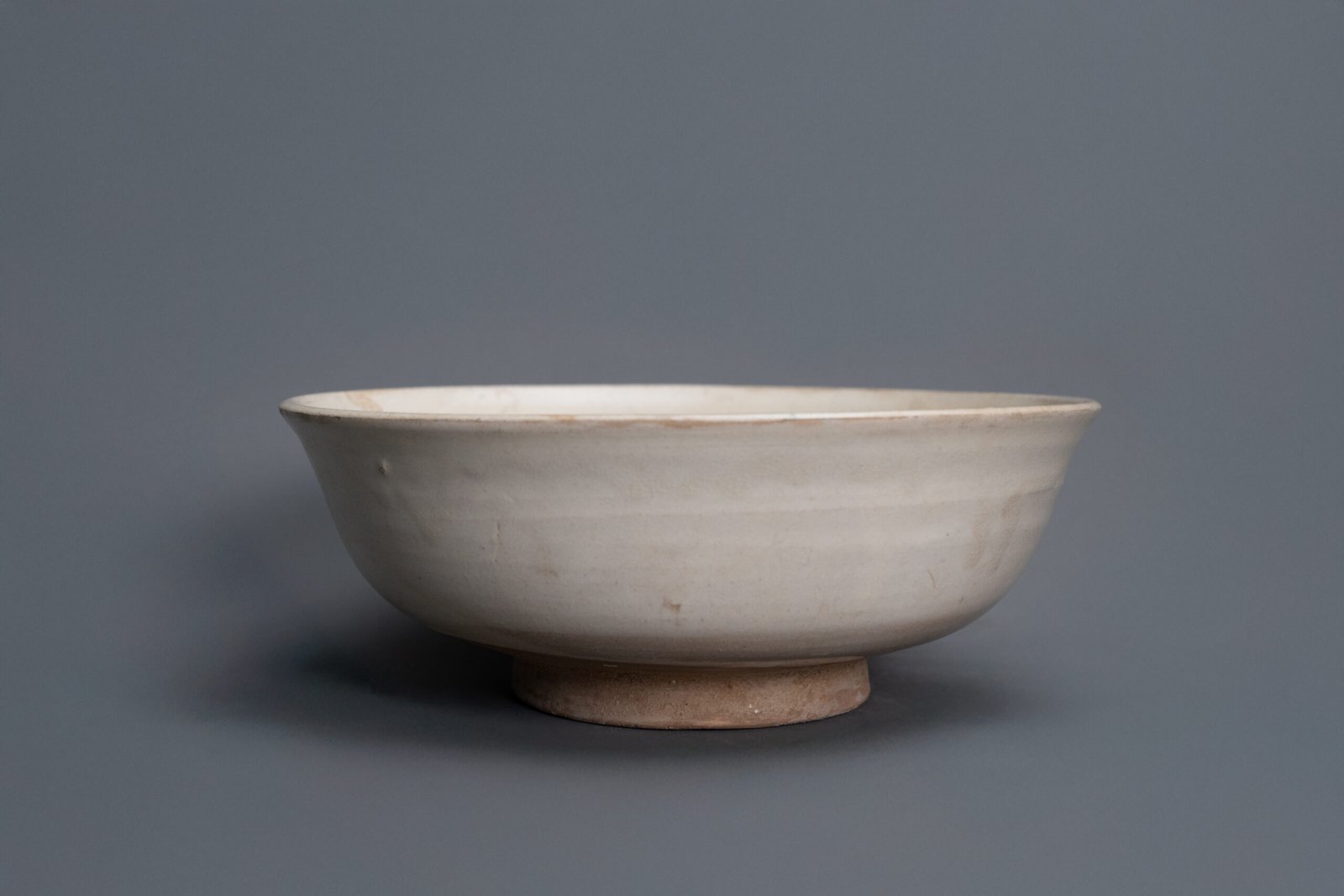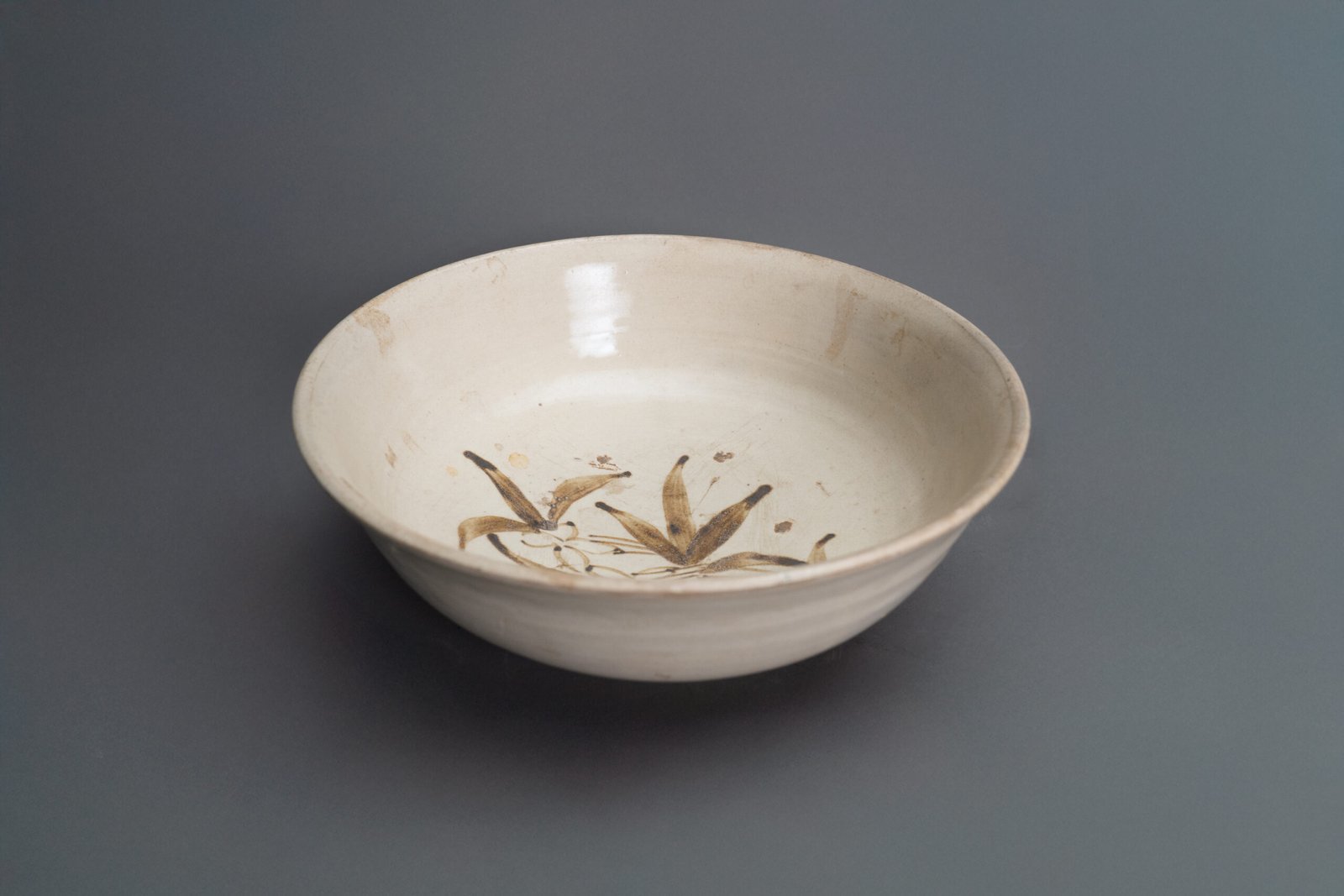 The interior decorated with a freehand floral spray in iron-brown beneath a creamy glaze, this shallow bowl exemplifies the expressive brushwork of Cizhou wares. The vessel’s wide, flaring rim and gently rounded walls rise from a neatly cut footring, while the unglazed base reveals a dense, buff body typical of northern kilns active during the Ming period.