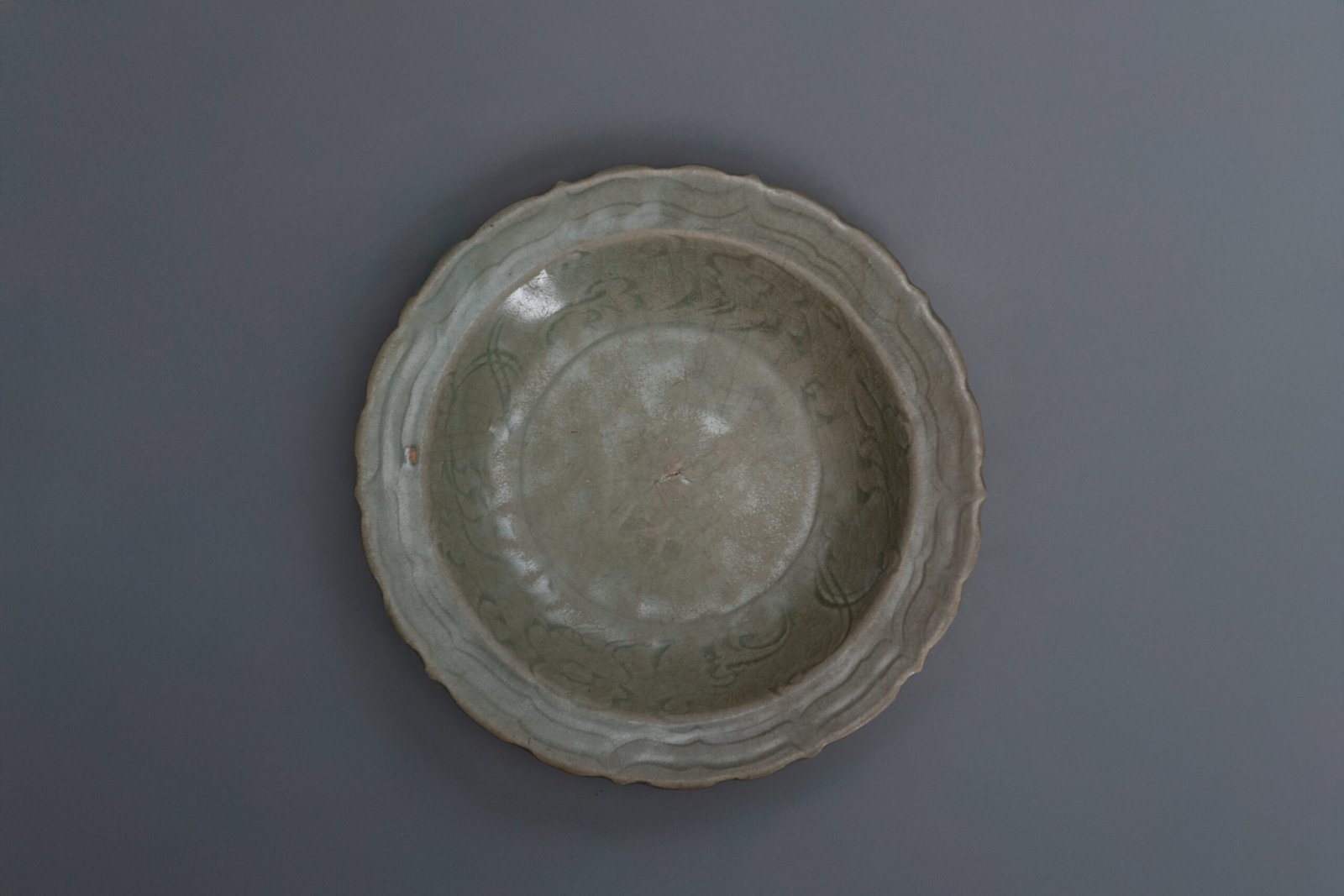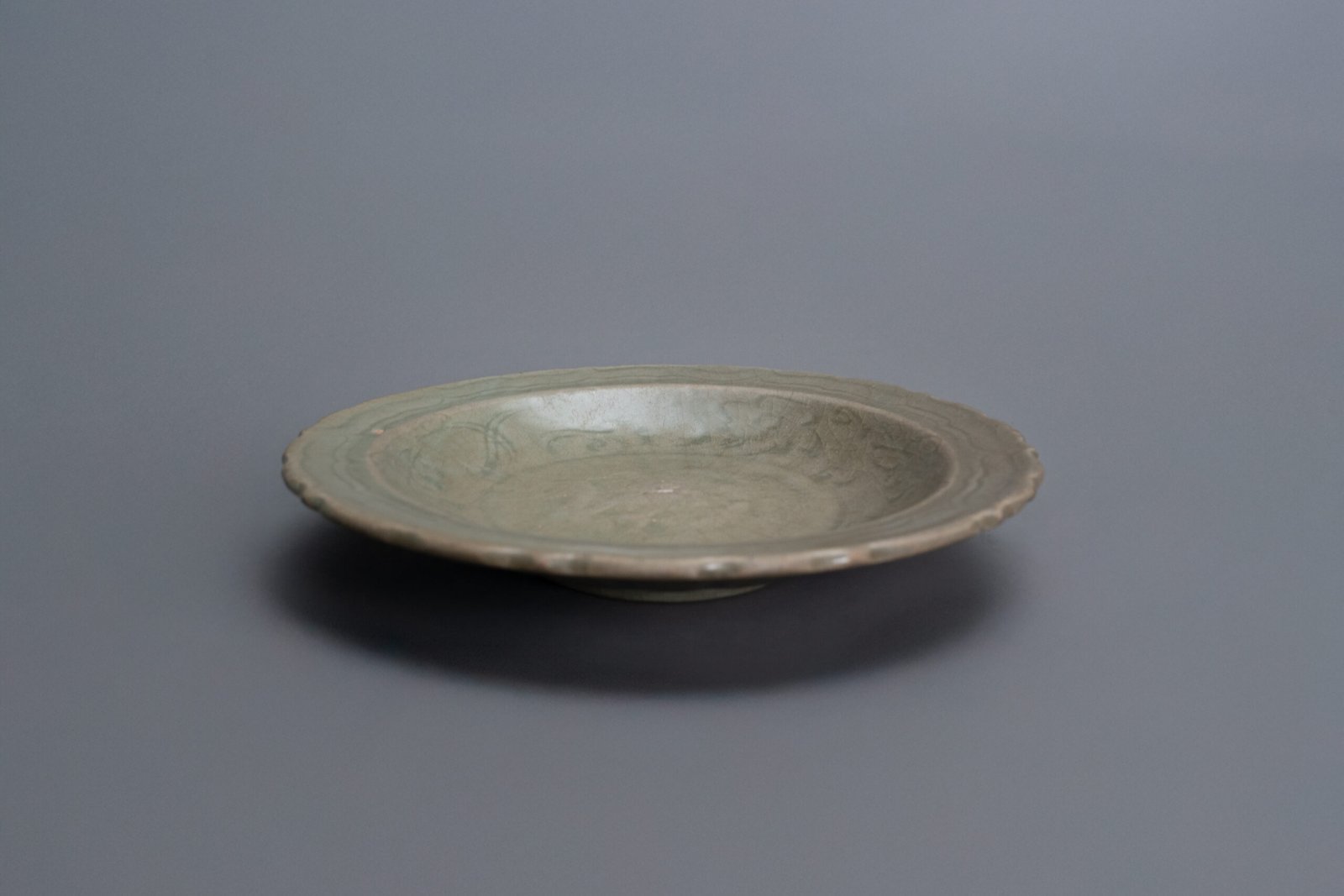Gracefully shaped with a barbed foliate rim, this shallow dish is coated in a thick, lustrous celadon glaze with a soft bluish-green hue, typical of Ming dynasty Longquan ware. The interior is subtly incised with a scrolling peony design around a central medallion with traces of a lotus blossom motif, the decoration emerging beneath the translucent glaze with quiet elegance.
