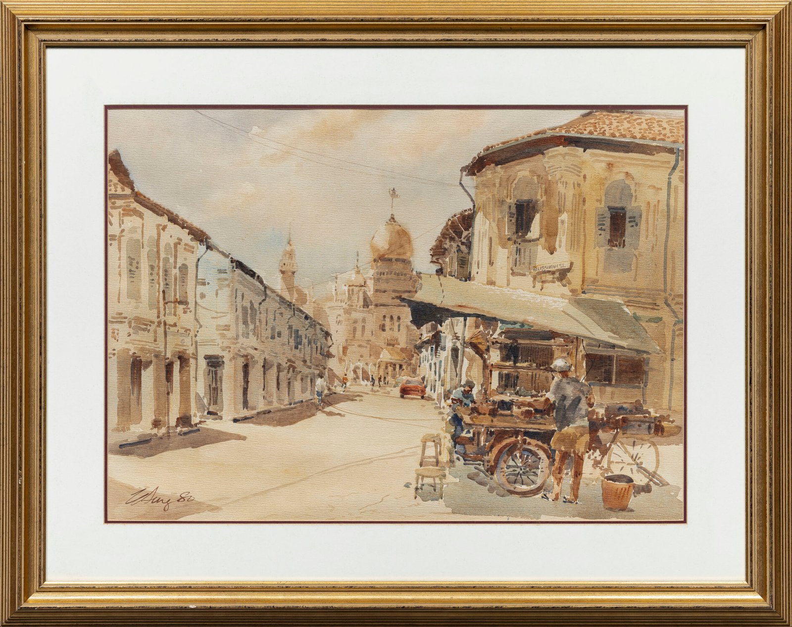 In the distance, the Sultan Mosque has been masterfully rendered to sparkle in the afternoon sun. A bright red car is parked along the street– a herald of modernity that would soon outpace the humble pushcart and render it a figment of the past.
