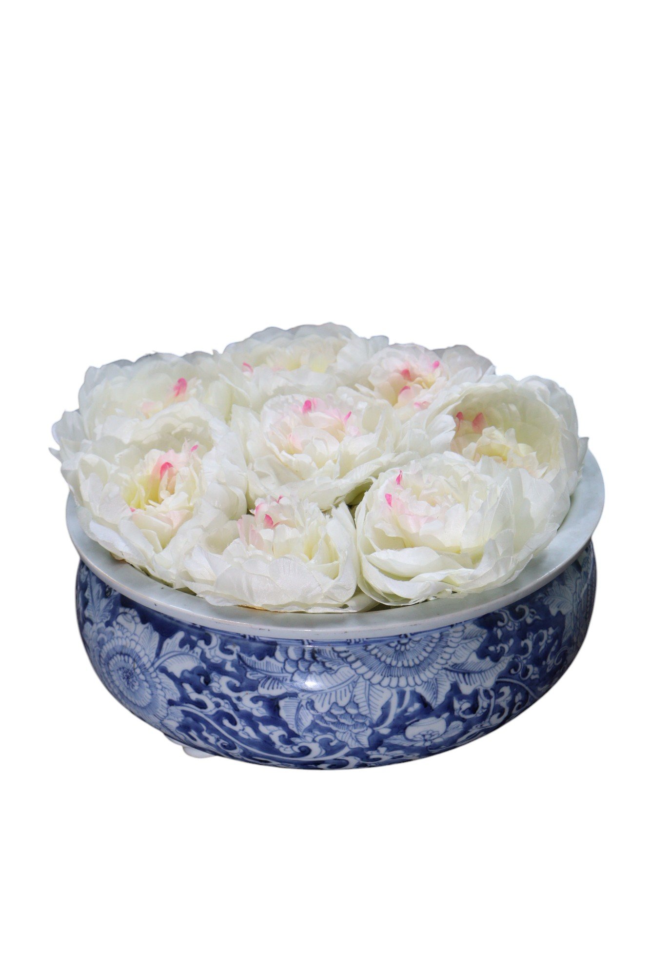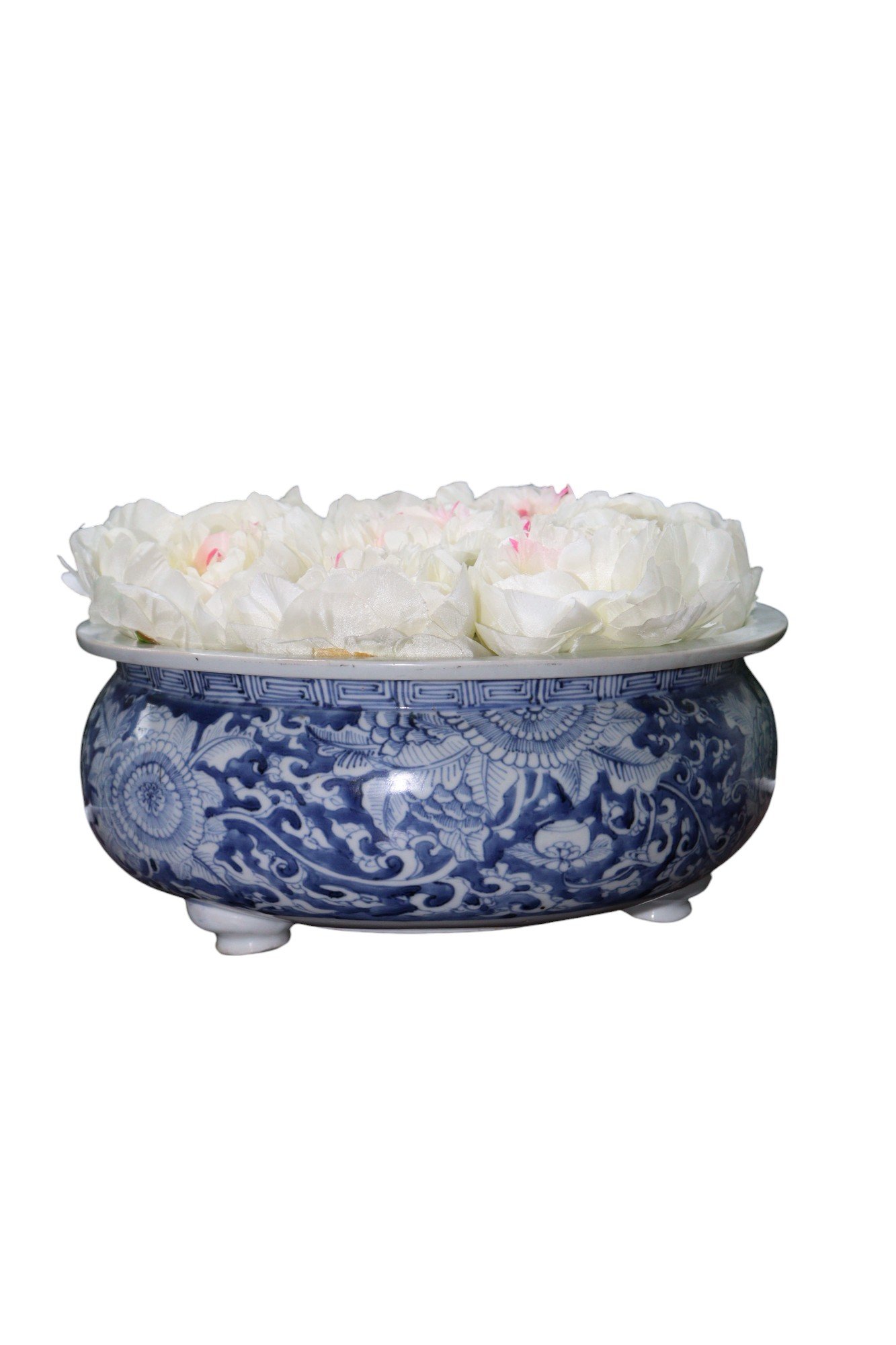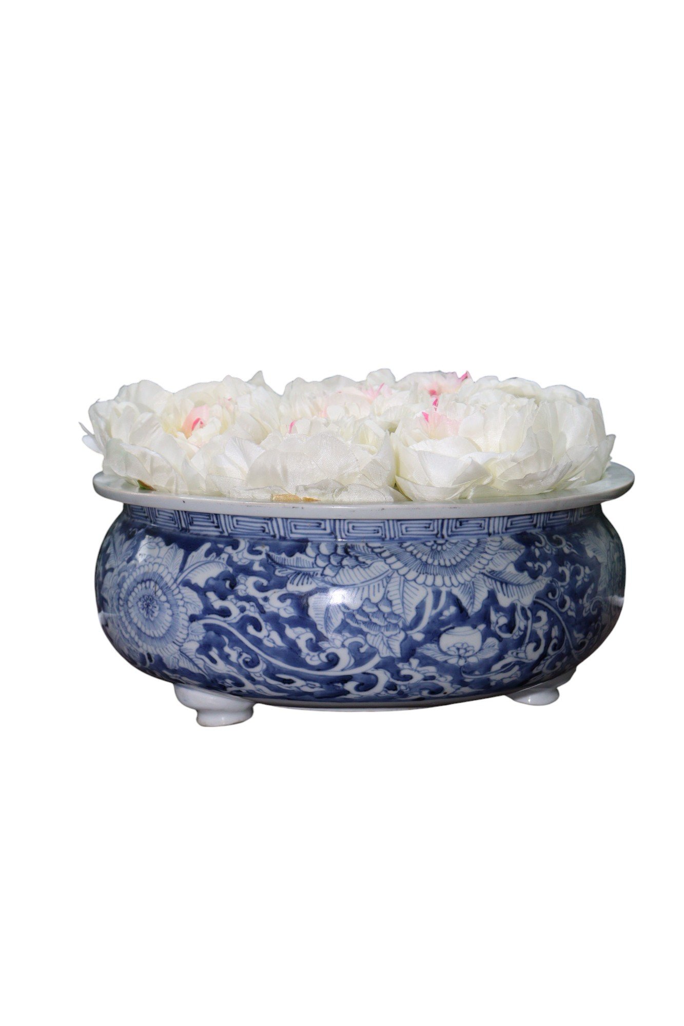 Decorated with intricate floral motifs, featuring swirling vines and large blooms that cover the surface. The vibrant cobalt blue contrasts beautifully against the white porcelain.