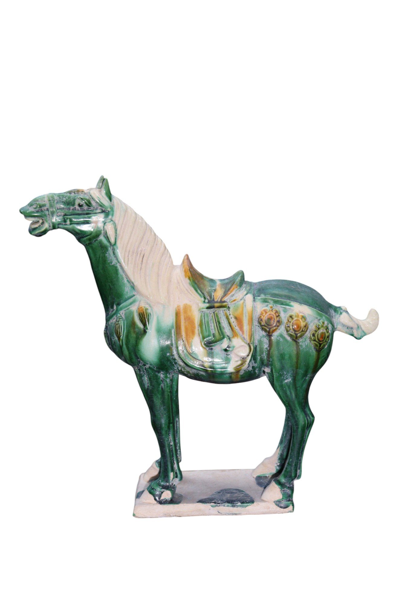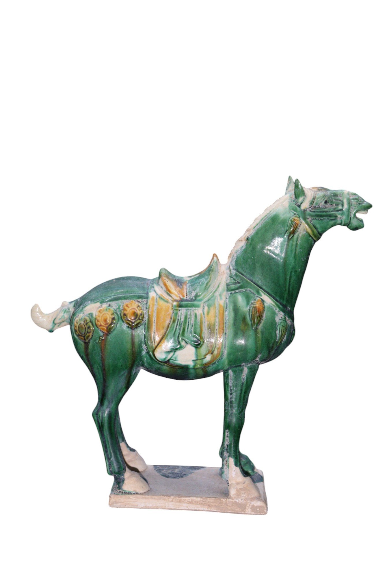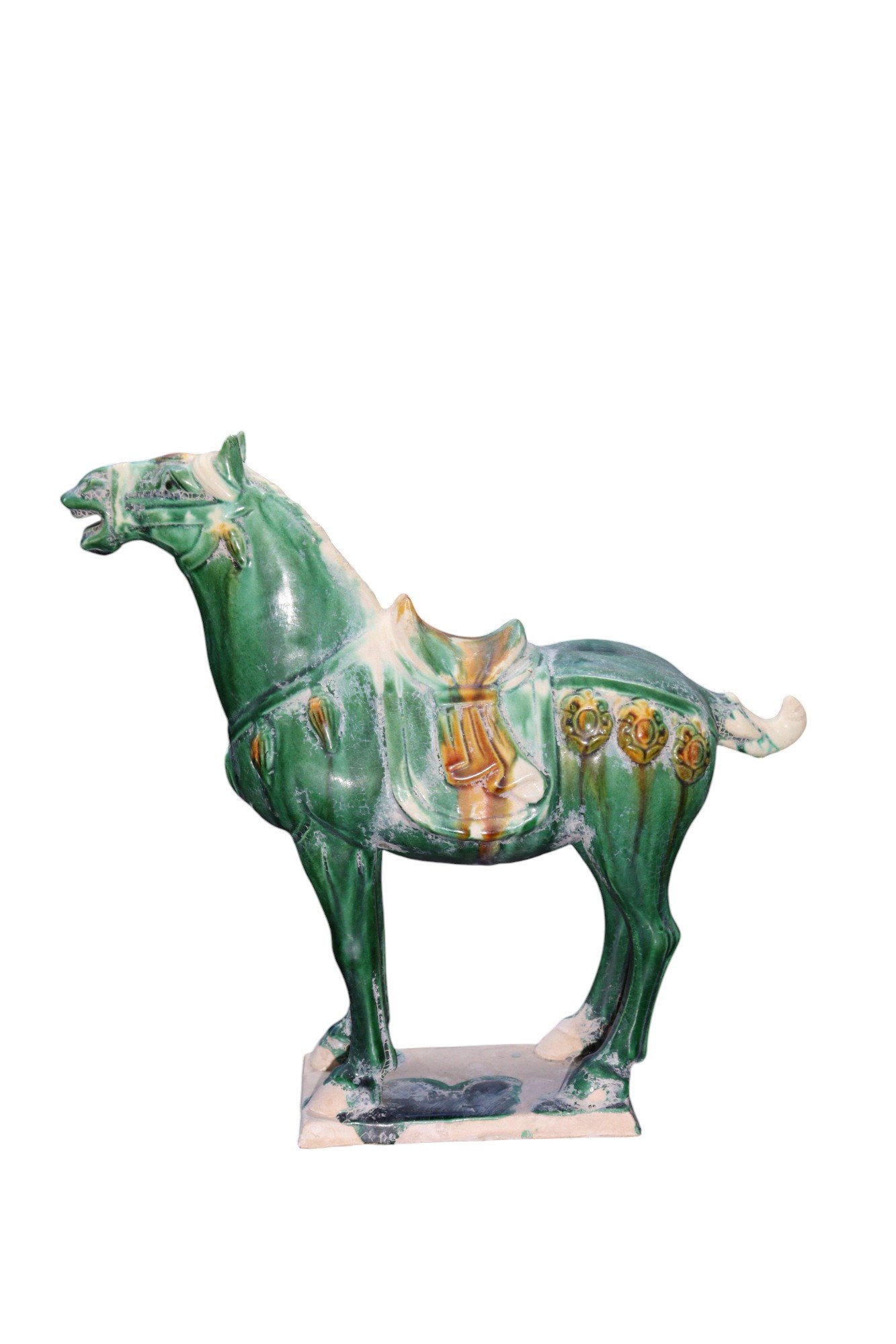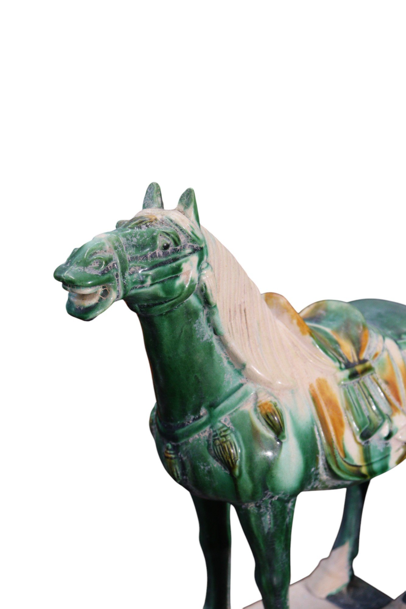 Horse figure beautifully modeled in a standing position, with Tang-style sancai glaze enhancing its sculptural details. The intricate saddle decorations, rendered in warm hues, contrast with the vibrant green body, adding depth to the piece.