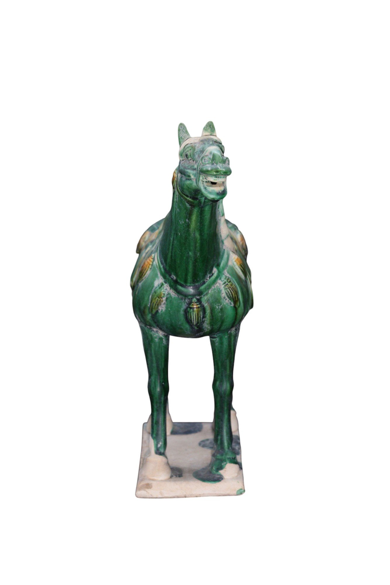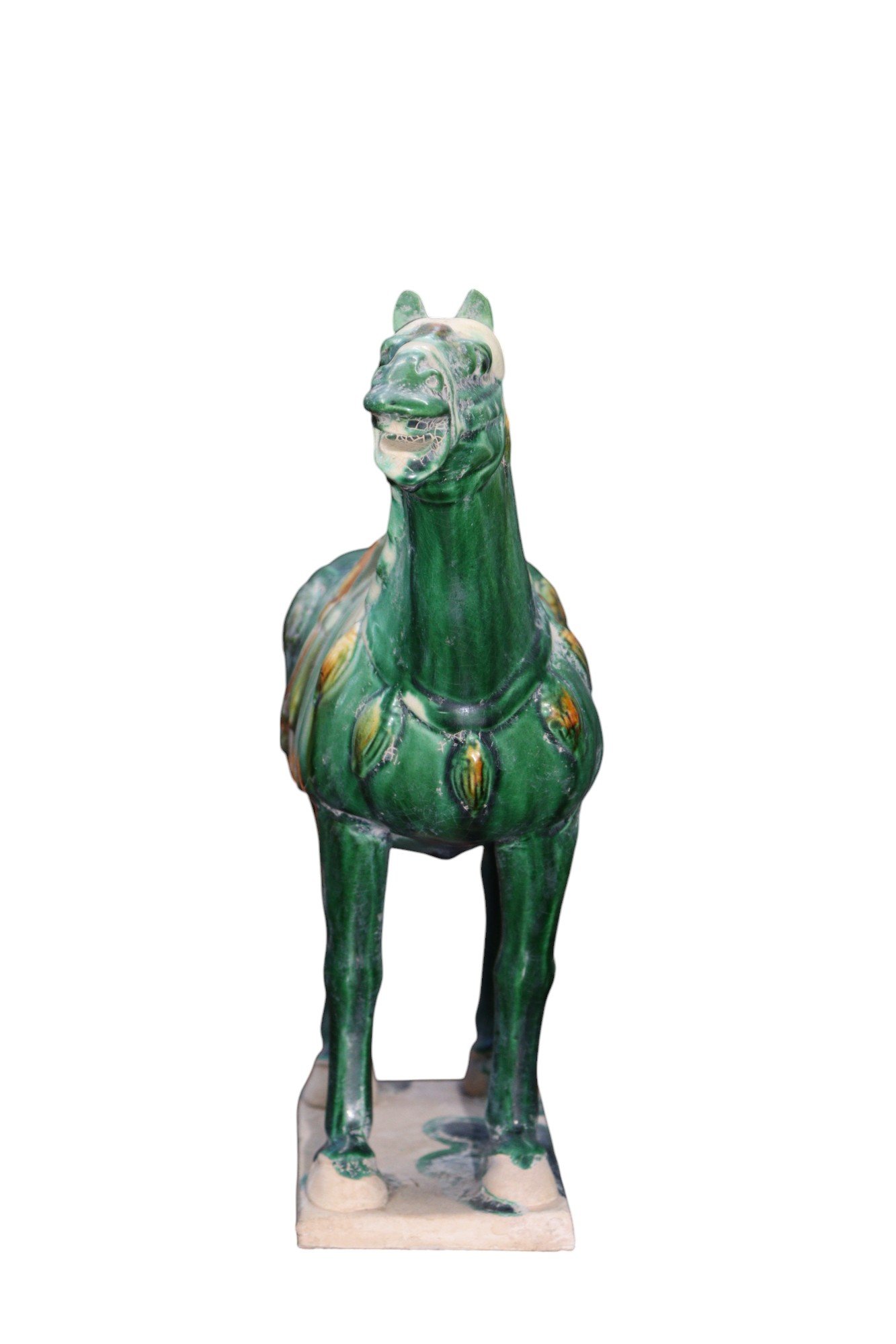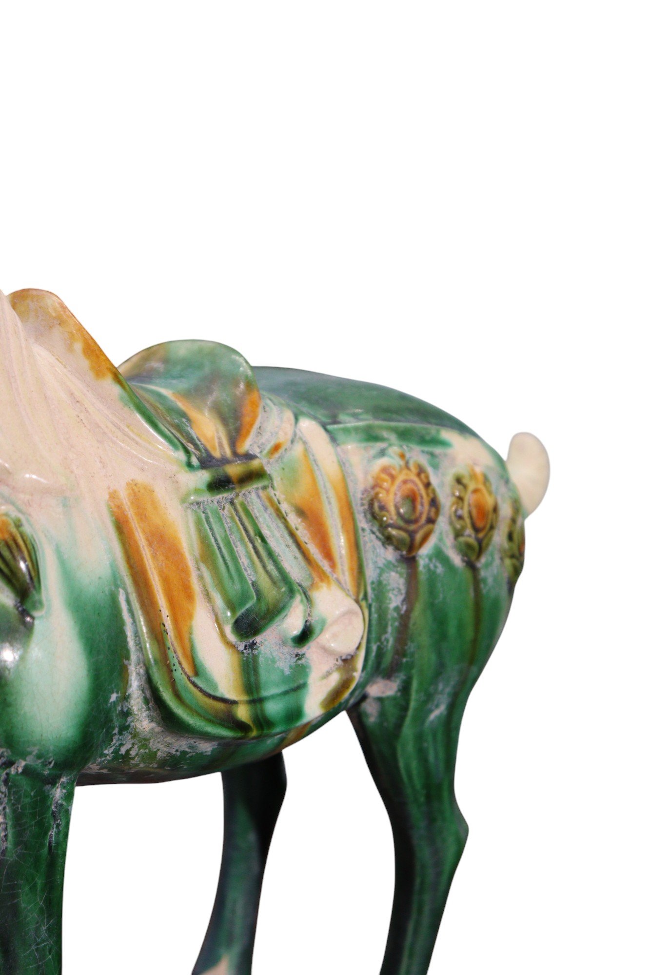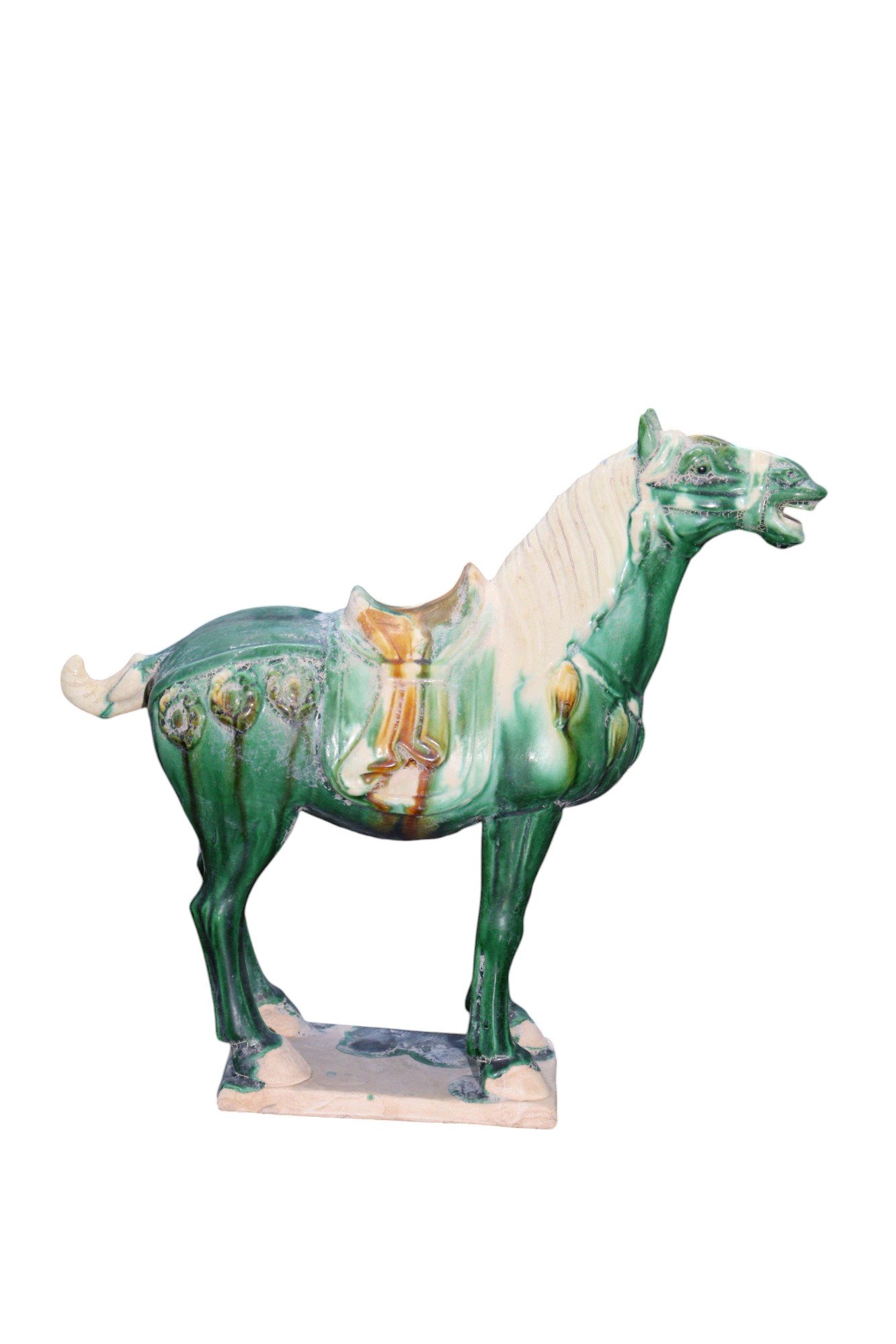 Horse figure beautifully modeled in a standing position, with Tang-style sancai glaze enhancing its sculptural details. The intricate saddle decorations, rendered in warm hues, contrast with the vibrant green body, adding depth to the piece.