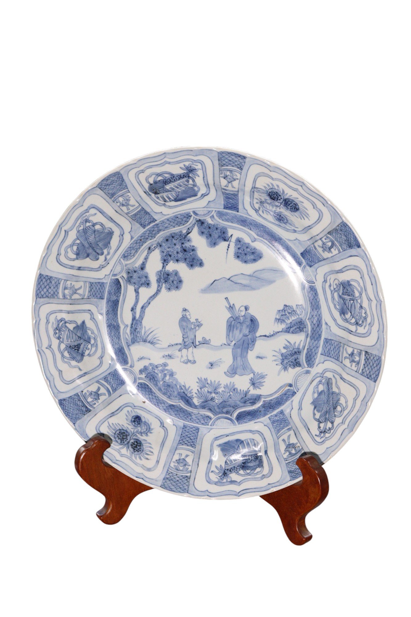 Underglaze blue Kraak ware dish featuring a central design of two figures standing amidst a landscape, flanked by stylized trees and mountains. The rim is adorned with alternating floral and Buddhist symbols.