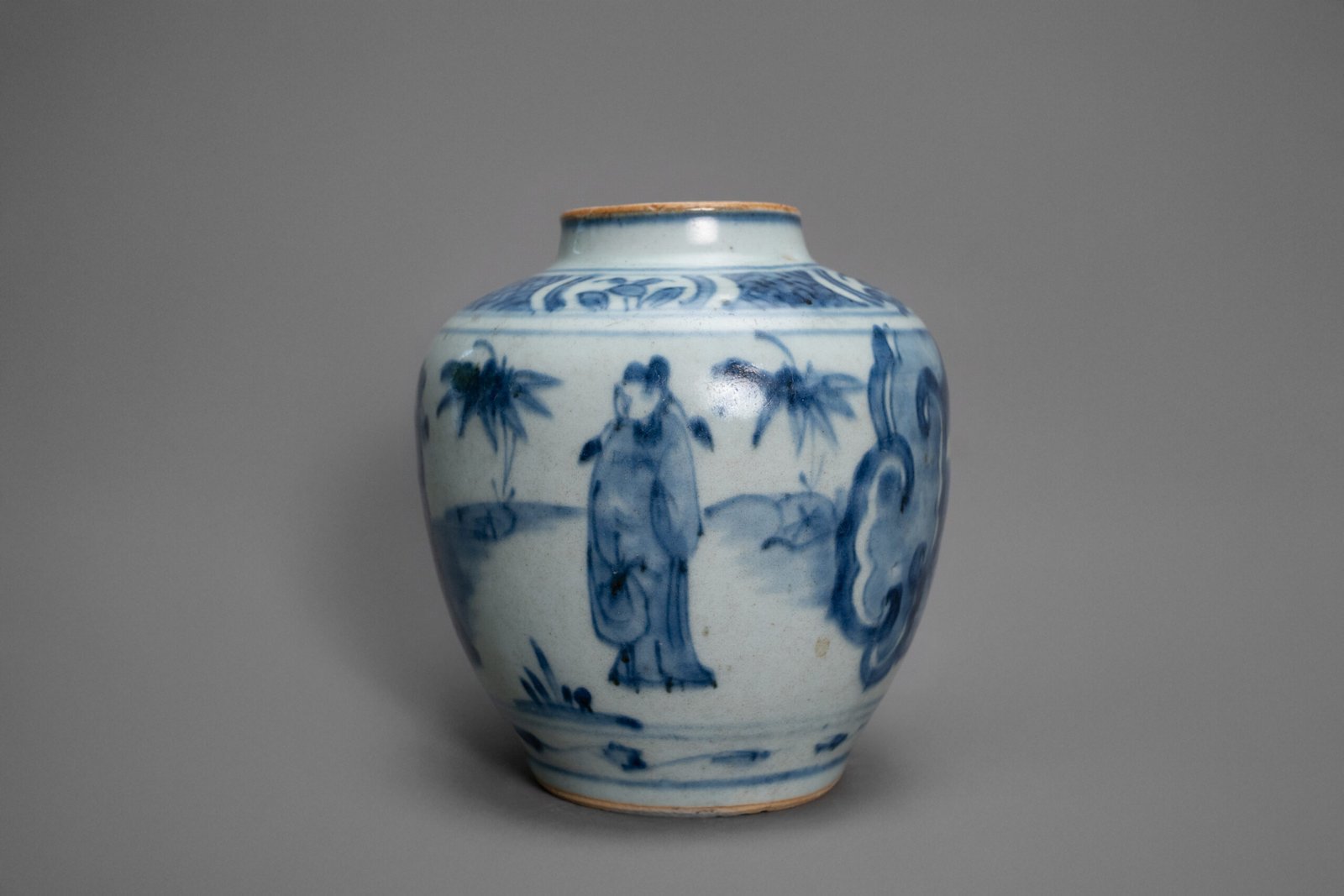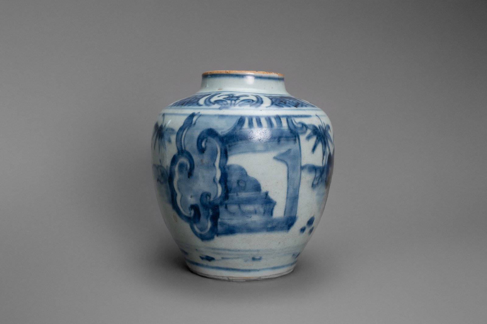 With broad shoulders rising to a short neck, the jar is finely decorated in lively washes of underglaze cobalt blue. The continuous scene depicts robed scholars wandering through a stylized landscape, among rocky outcrops, palm trees, and pavilions glimpsed through billowing clouds. A band of linked classic scrolls adorns the shoulder, enhancing the rhythmic movement of the design.