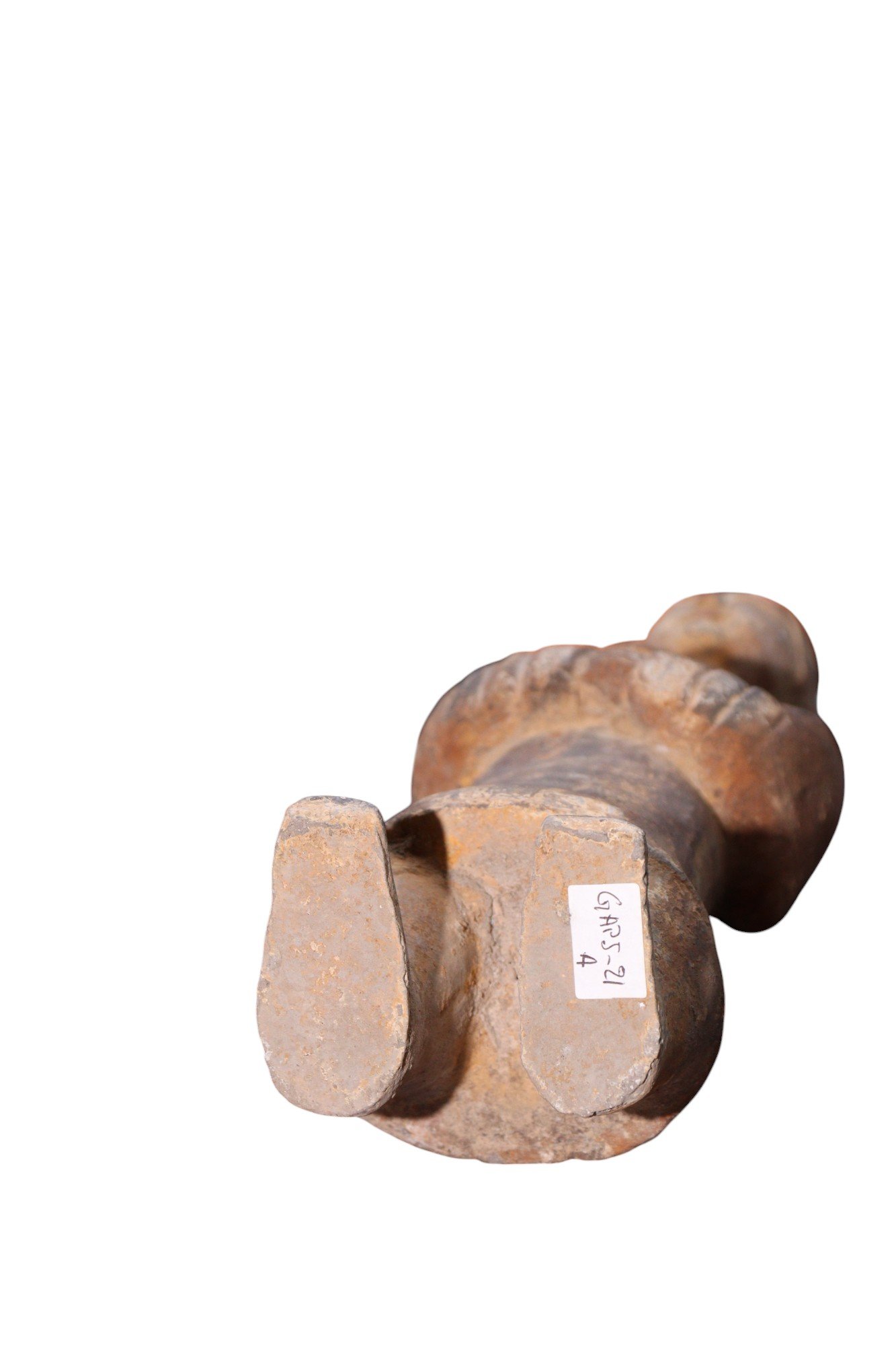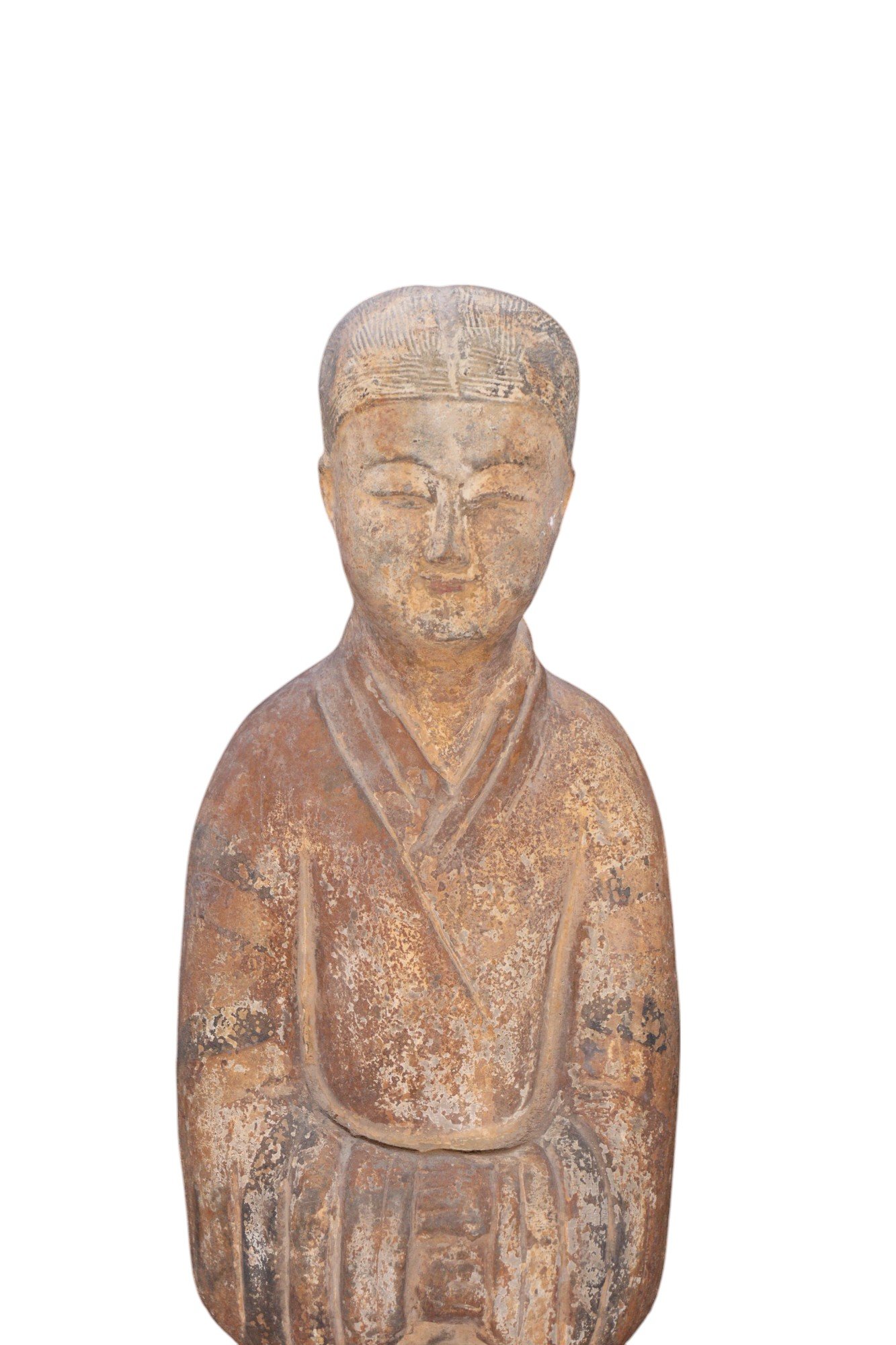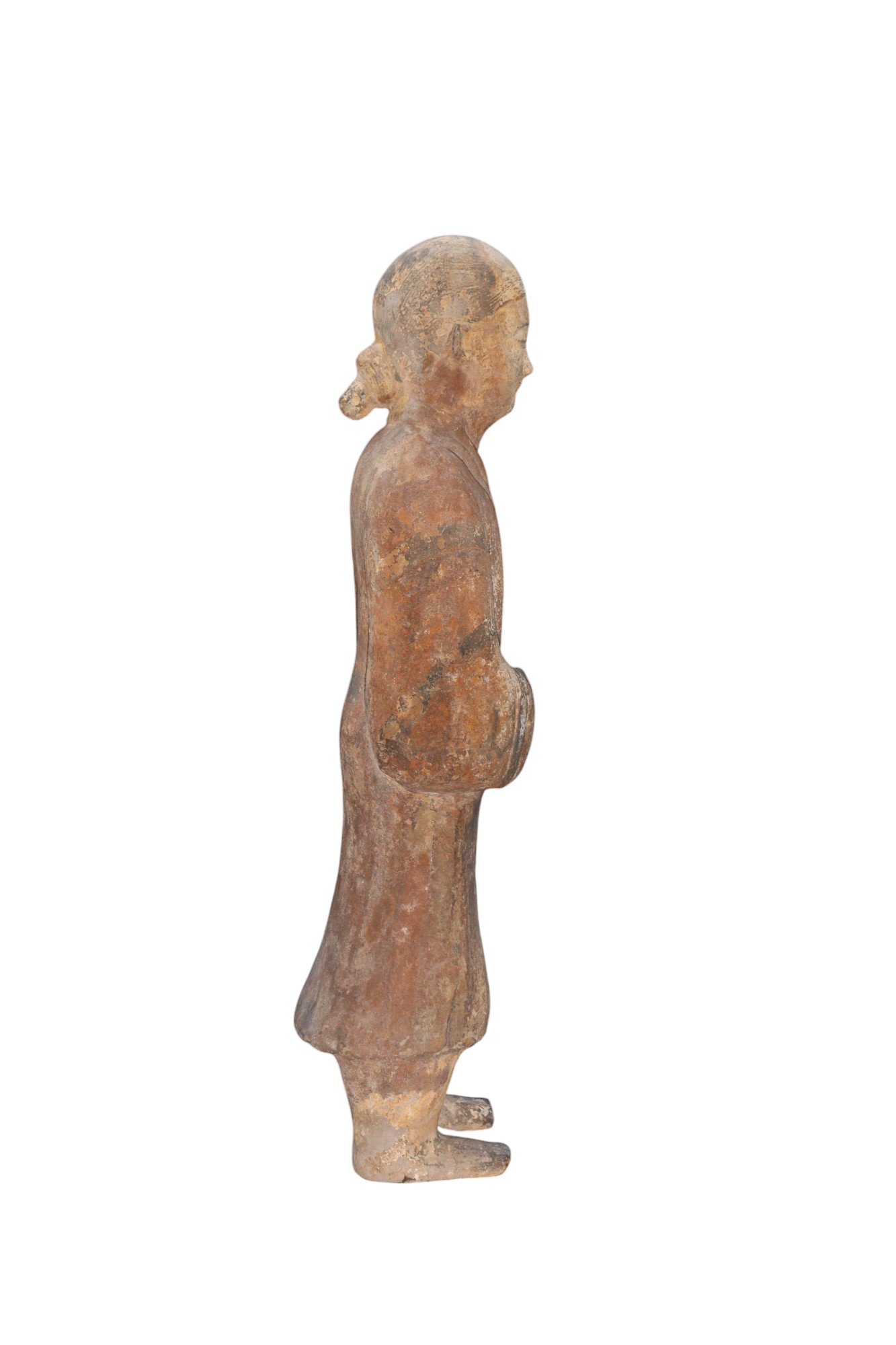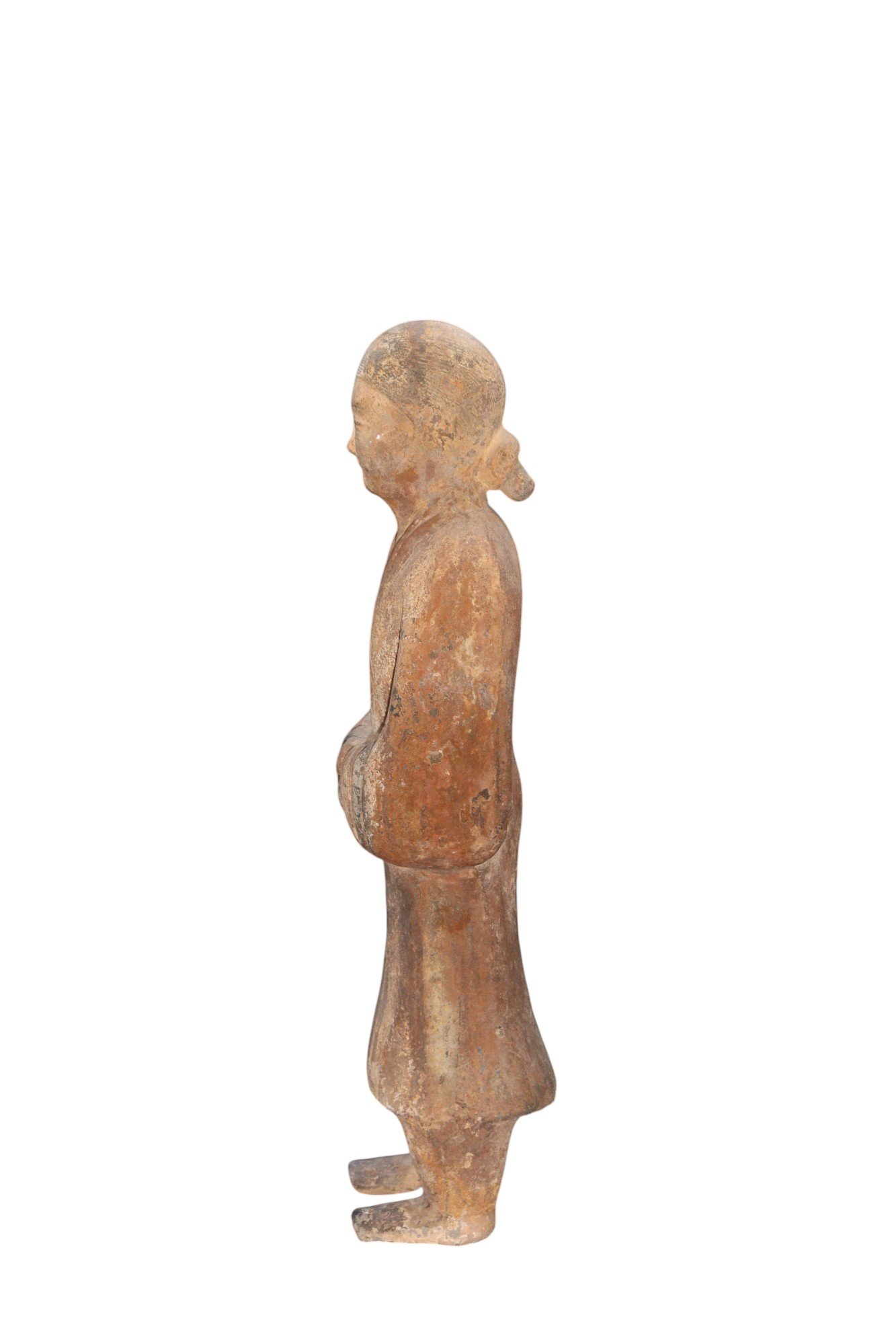 Modeled standing in a solemn, upright pose, with hands clasped in front of the body. The figure wears a simple, yet elegant robe, with subtle details defining the folds and creases of the garment. Terracotta figures such as this were commonly placed in tombs during the Han Dynasty, serving as “spirit figures” (Mingqi) that would accompany the deceased to the afterlife. The simplicity and muted design of the figure reflect its utilitarian function, where form and posture were more important than elaborate decoration. Such figures, typically made in the likeness of attendants or guards, were believed to protect the deceased and provide companionship in the afterlife.
